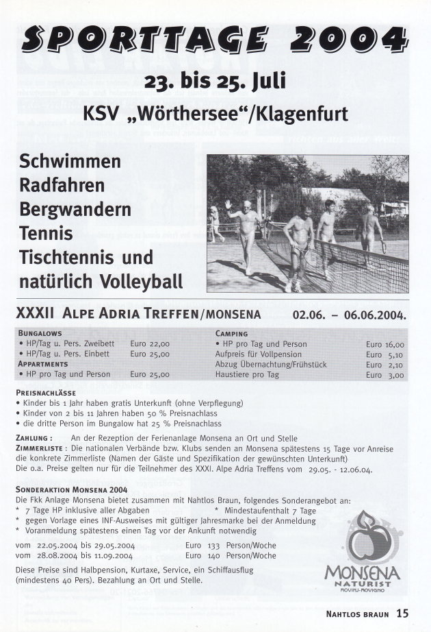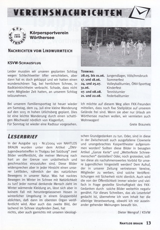 NAHTLOS BRAUNInformationen für NaturistenOffizielles Organ des Österreichischen Naturistenverbandes (ÖNV) Ausgabe 194 Nr. 2 • Sommer 2004 |