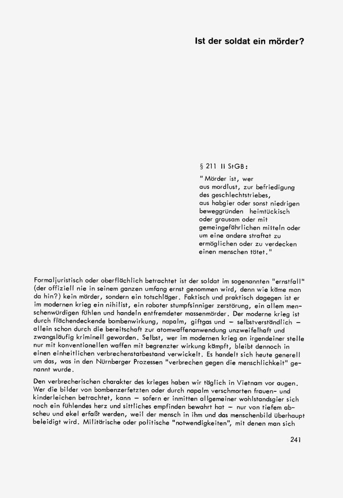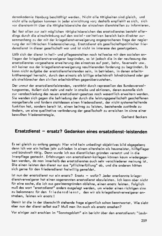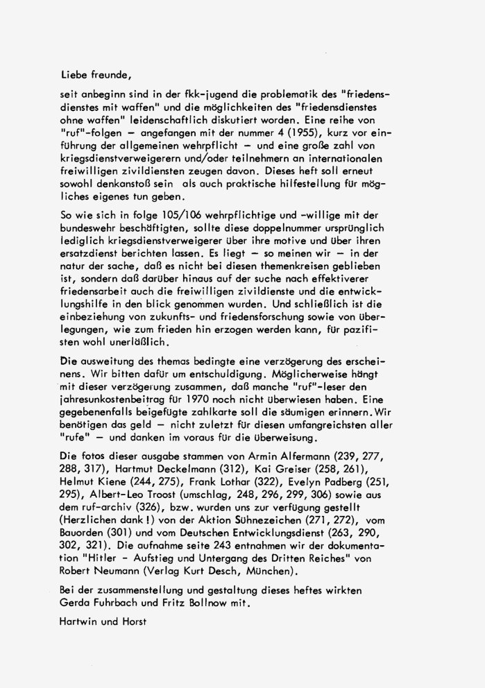 | In diese Ausgabe von „der ruf” mit einem Umfang von 116 Seiten dreht sich alles um die Themen „Kriegsdienstverweigerung” und „Ersatzdienst”. Auf den Ersatz-, bzw. Zivildienst wird ausführlich eingegangen und alle Facetten dieser Verweigerung des Dienstes an der Waffe dargestellt, von der Hilfe in der Alten- und Behindertenpflege, bis hin zu der Arbeit in Entwicklungsländern. |