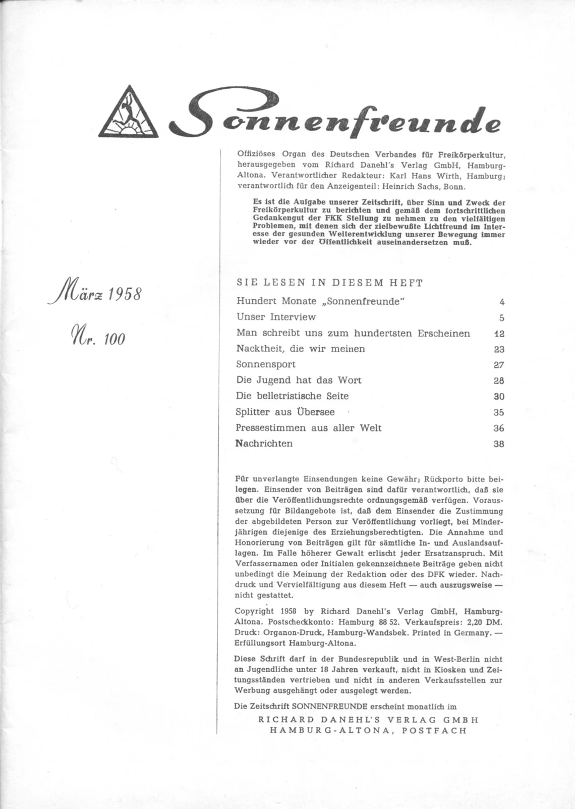 SonnenfreundeOffiziöses Organ des Deutschen Verbandes für Freikörperkultur Heft 100 • März 1958 |