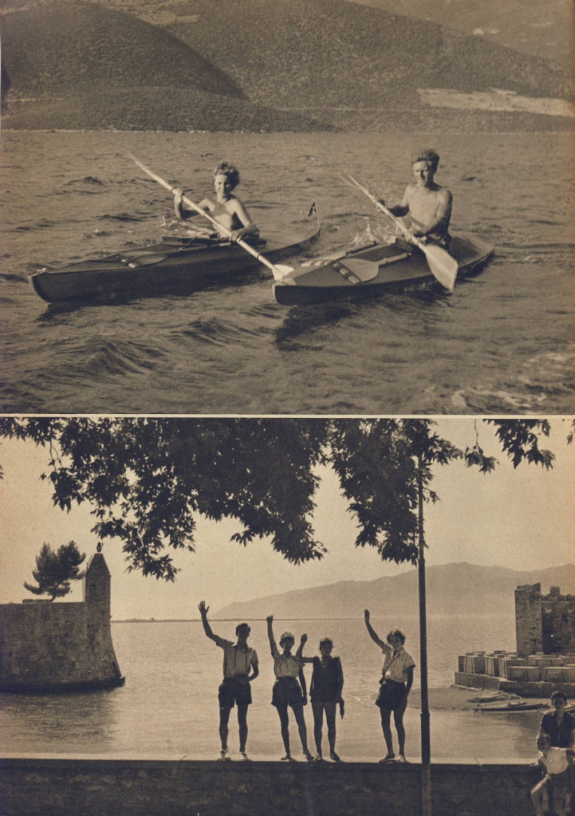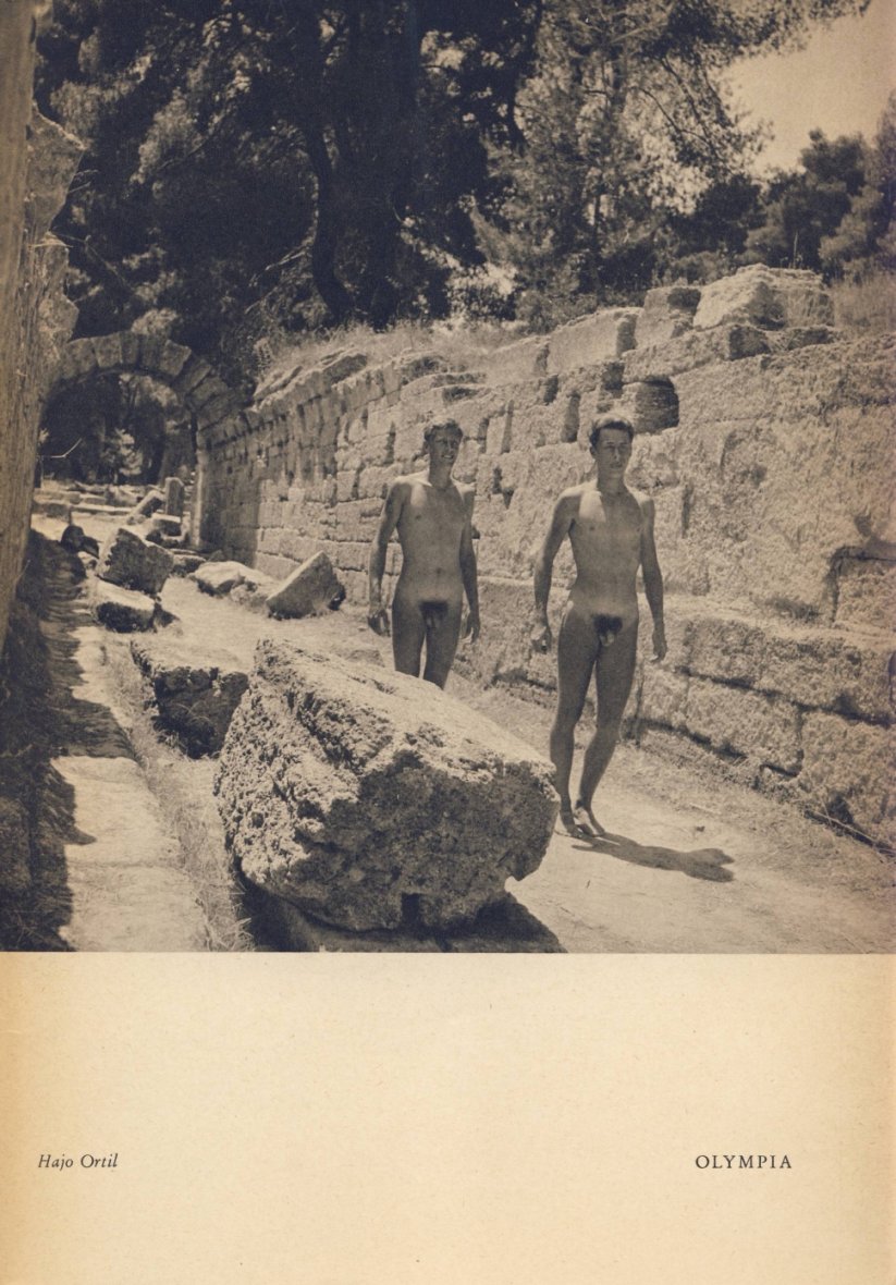 | Im Jahre der Sechzehnten Olympischen Spiele unserer Zeit zogen sieben Freunde hellenischer Helle und Leibesfreude zu den Stammlanden des Nestor, Agamemnon und Menelao, auf die Insel des Pelops. In ihren wendigen Booten fuhren sie von den Gebirgen Arkadiens die grünen Wasser des Alpheios hinab gen Olympia. |