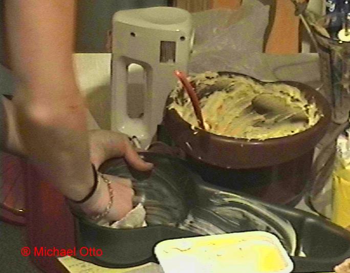 Die Kuchenform gut einfetten und den Teig hinein geben. Dabei nicht vergessen, von verschiedenen Stellen des Teiges Geschmacksproben zu nehmen. Ist man nun davon überzeugt, dass der Teig in Ordnung ist (ggf. noch einmal abschmecken), die Kuchen- form mit dem restlichen Teig in den Backofen stellen und bei 180° ca. 60 Minuten backen. |