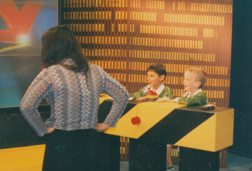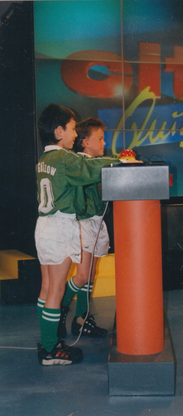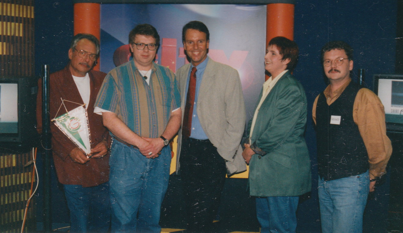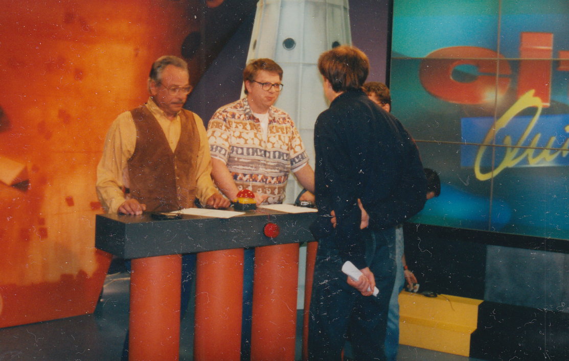Ferdinand und ich am Rate-Pult Ferdinand, ich, Quizmaster Ermo Gödelt,