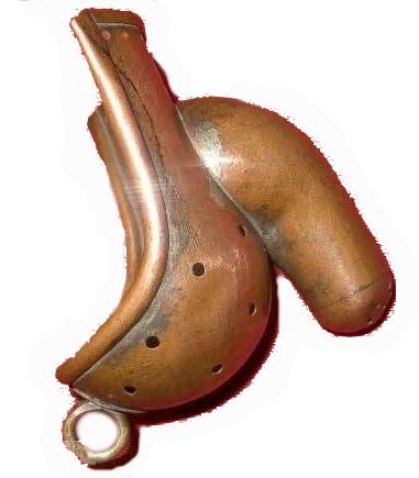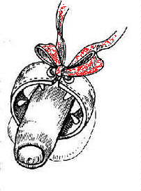 Links die Zeichnung eines Lederriemens mit nach innen gekehrten spitzen Dornen.