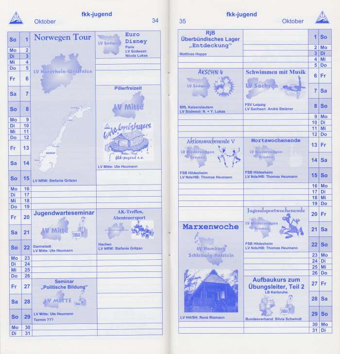 Dieser Jahreskalender gibt einen Überblick über die wichtigsten Veranstaltungen der fkk-jugend. Weiterhin eine Vorstellung der Landesverbände mit Adressenliste und die Ferientermine.