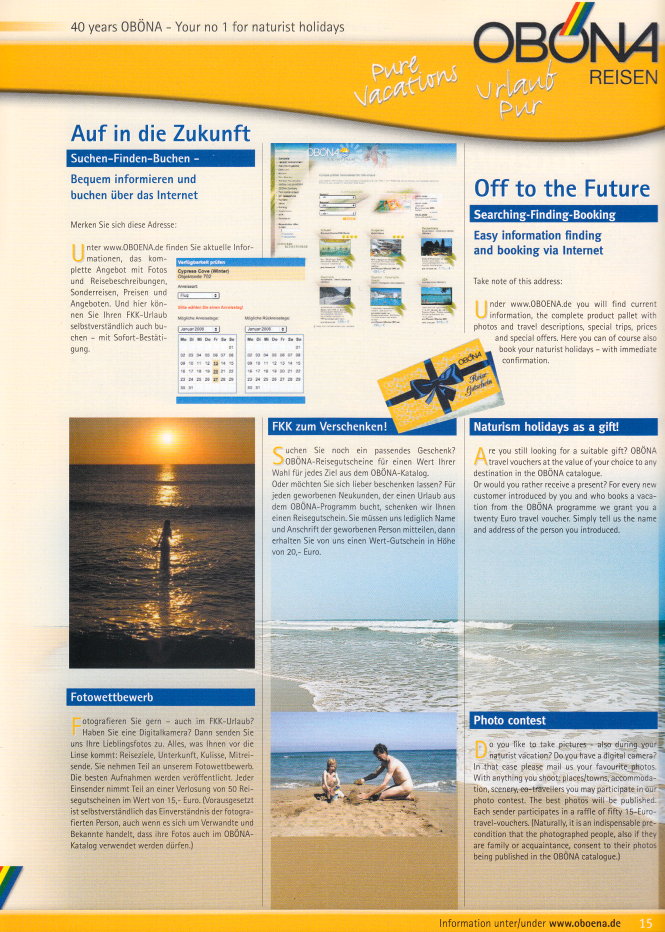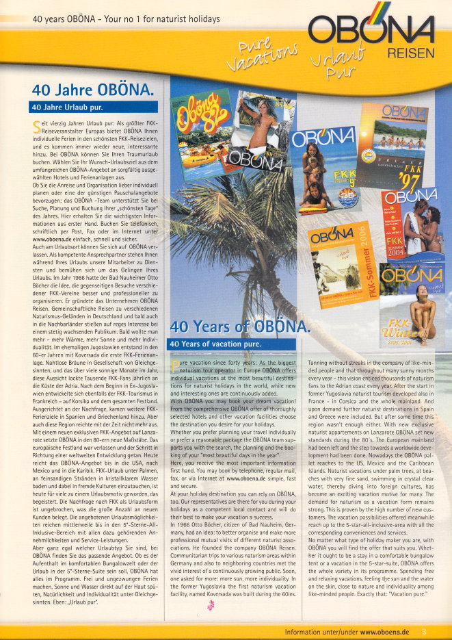 20-Seitige Sonderbroschüre, herausgegeben anlässlich des 40-jährigen Bestehens des FKK-Reiseveranstalters Oböna.