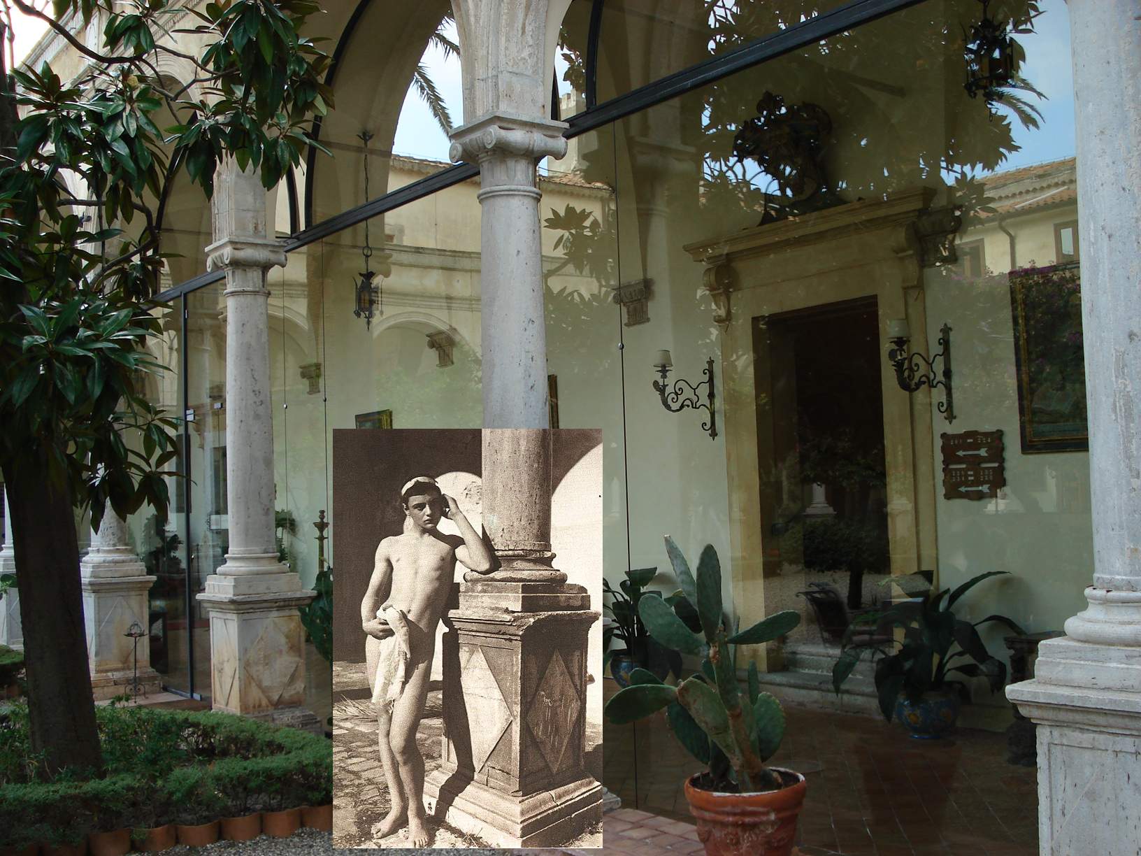 Fotomontagen → © Giovanni Dall'Orto Wilhelm von Gloeden erstellte einige seiner Aufnahmen im Kreuzgang des Klosters von Taormina. Heute beherbergen die historischen Mauern des ehemaligen Kloster aus dem 14. Jahrhundert ein Luxus-Hotel. Selbst die Originalfresken sind noch erhalten. Vom Hotel aus blickt man auf das Ionische Meer. Es ist 2 km vom Strand Isola Bella, 55 km vom Ätna und 68 km vom Flughafen Catania entfernt. Giovanni Dall'Orto erstellte seine Aufnahmen im September 2006 |