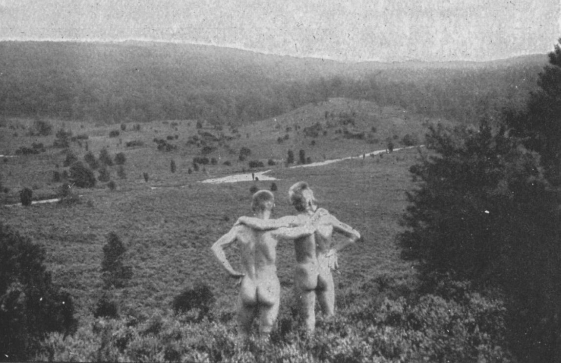 Schon in den frühen 1930er Jahren wanderte man bereits gerne nackt in der Lüneburger Heide. Die Aufnahme stammt aus dem Totengrund, ein etwa 30 ha großer Talkessel, der sich am Rande des Wilseder Bergs nahe Wilsede befindet und auch nur knapp 4 km von Undeloh (Naturistenweg) entfernt ist.