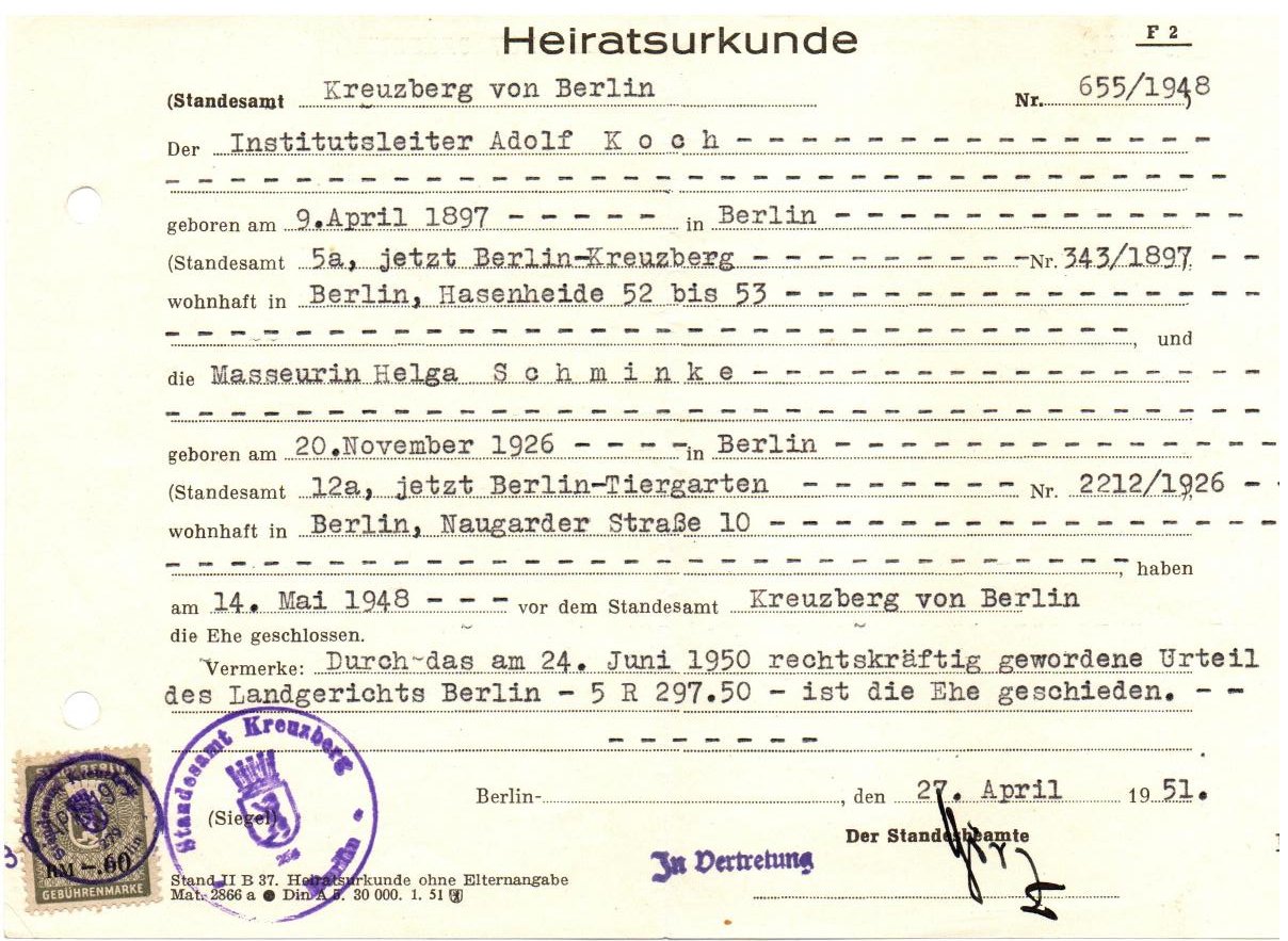 Die Heiratsurkunde wurde mir freundlicheweise von dem Sohn von Adolf Koch zur Verfügung gestellt.