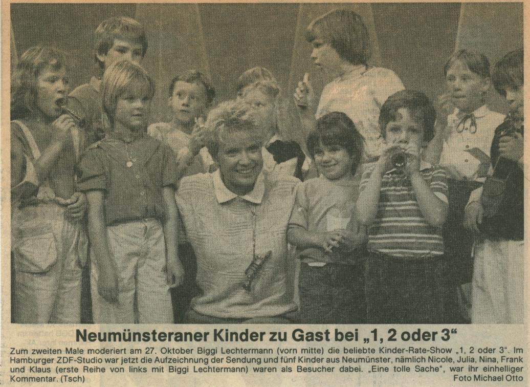 Bei der Kinder-Quiz-Sendung „1, 2 oder 3” habe ich regelmäßig fotografiert, erst bei den Sendungen mit Michael Schanze, später dann bei den Sendungen mit Biggi Lechtermann. Da ich in Neumünster der „Haus-und-Hof-Fotograf” einer Mädchen-Handballmannschaft war, lag es nur nahe, auch bei der Produktionsfirma mal nachzufragen, ob die Handball-Kinder (zu Michael Schanze) und später Kindergarten-Kinder (zu Biggi Lechtermann) nicht auch mal als Zuschauer zur Sendung mitkommen könnten.