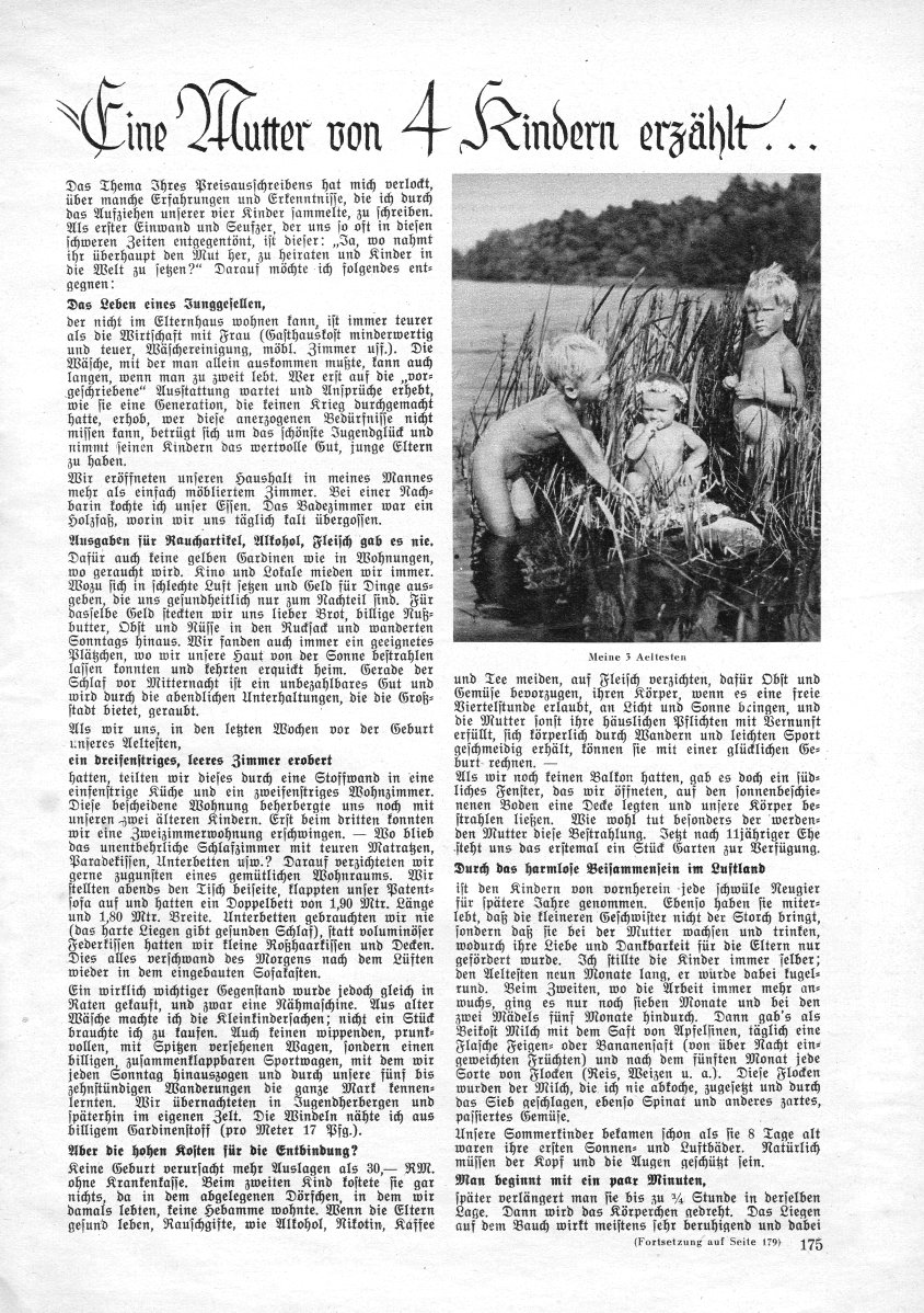 Neuform-RundschauHeft 8 • August 1933» Eine Mutter von 4 Kindern erzählt... « - nein, sie berichtet über das Sonnen-, Licht- und Luftbad und erklärt die ganzen Vorzüge der Nackt- heit. Bevor die Familie einen eigenen Garten hatte, fanden die „Nackt”-Bäder in der Wohnung (bei geöff;netem Fenster) statt, am Wochenende dann auch schon einmal außerhalb, in der Natur. Durch die Unbefangenheit im Umgang mit der Nacktheit wurden ihre Kinder schon früh, vorallem aber richtig, aufgeklärt. |