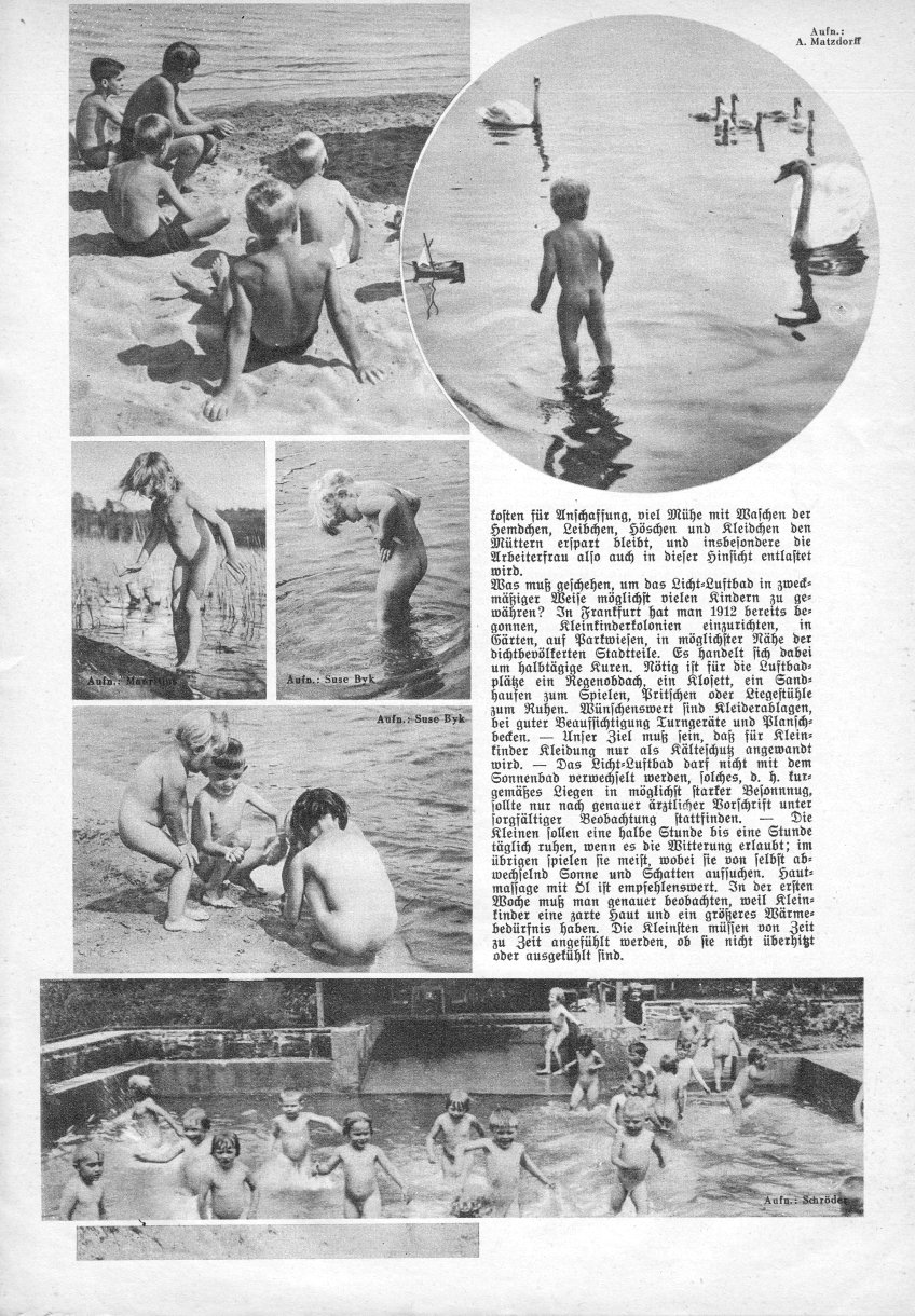 Dieses Monatsmagazin der Reformhäuser berichtete mit zahlreichen Bildern im August 1934 über »Das Licht-Luftbad der Kleinkinder«. Im wesentlichen geht es in diesem Artikel darum, wie wichtig die Sonneneinwirkung gerade bei Kindern ist - nicht nur für die Gesundheit selbst, sondern auch zur Abhärtung. Der Nutzen der Kleiderersparnis, also der Nacktheit, wird ganz besonders hervorgehoben. |