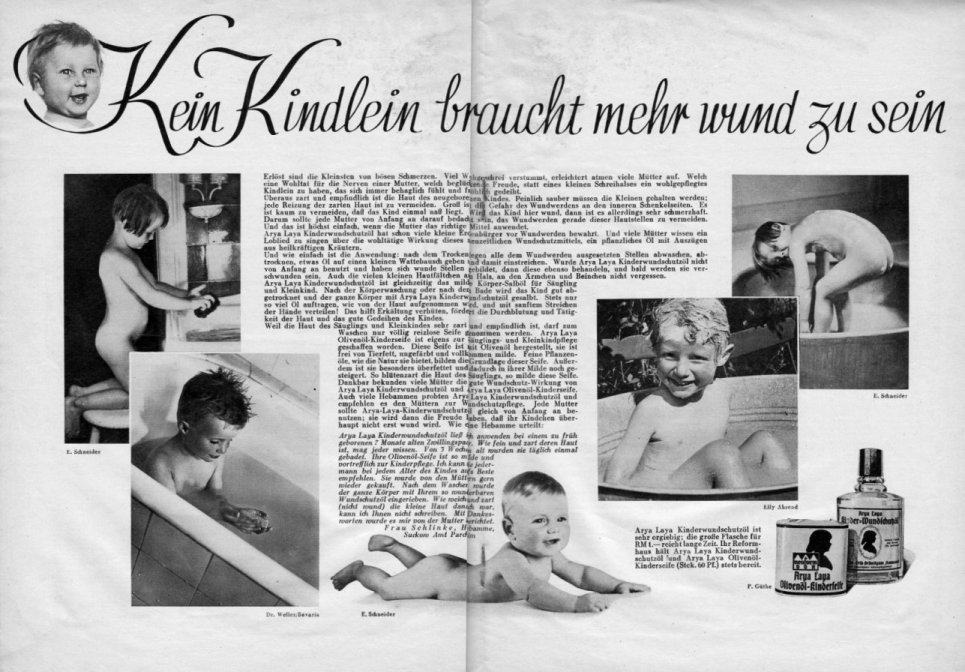 „Das Wunder der Haut” war das Hauptthema dieser Ausgabe des Reformhaus-Heftes. Erklärt wird der Aufbau der Haut und ihre Funktion als Schutz und natürlich die Pflege der Haut mit Produkten aus dem Reformhaus. Es wird erwähnt, dass es gerade für Kinder sehr gesund ist, wenn es das Wetter erlaubt, immer möglichst nackt zu sein, um so Luft und Sonne an den ganzen Körper gelangen zu lassen. In dem zweiseitigen Artikel „Kein Kindlein braucht mehr wund zu sein” (Doppelseite) werden nicht nur die entsprechenden Wundschutzmittel (Öle und Pulver) vorgestellt, es wird auch darauf hingewiesen, die Kinder möglichst oft „nackig” herum laufen zu lassen, um halt so Wundstellen vorzu- beugen, denn, wo keine Windel oder unbequeme Kleidung scheuert, da kann das Kind auch nicht wund werden. |