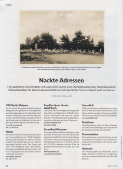 ZITTY... mit Terminen zu allen wichtigen Veranstaltungen, wie Ausstellungen, Konzerte, Museen, Festivals, Theater, Clubs Restaurants und so weiter. Auflage: 12.760 - Erscheint alle zwei Wochen, Mittwochs (Stand: Mai 2019) In Heft 9/2019 hieß es „Runter mit den Klamotten!”, denn die Freikörperkultur erlebt zur Zeit eine Renaissance, nicht nur in den FKK-Vereinen, sondern auch in WGs und an Badessen. Für ZITTY wurden junge Berliner FKKler befragt. Man will sich loslösen von der verkrampften Gesellschaft ... und die Nacktheit für sich, ist schon ein befreiendes Gefühl. Das nackte Zusammenleben in einer WG, nacktes Yoga in der Hasenheide - oder eine Nacktwanderung im Wald, der 10-seitige Artikel „Nackt ist frei” gibt Auskunft: Adressen von FKK-Vereinen in Berlin, FKK-Möglichkeiten an den Seen und Liegewiesen. Natürlich fehlt auch die Erklärung zur rechtlichen Lage nicht. Zusammengefasst lässt sich sagen: ein gut recherchierter Bericht, der sicherlich vielen jungen Leute den Naturismus näher bringt. ... und hier geht es zur Webseite → www.zitty.de. Hier könnt Ihr das Heft auch bestellen ! |