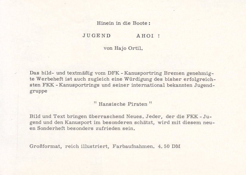 FKK-Prospekte → Beilagen Beilage... zum FKK-Sonderheft „Jugend Ahoi !” von Hajo Ortil. Diese kleinen »Prospekte« waren lose den Heften beigefügt.