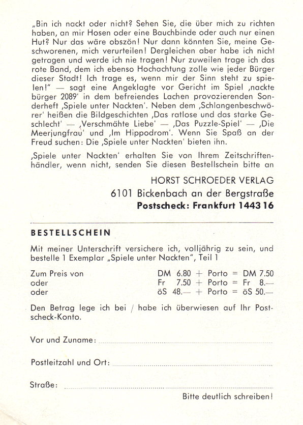 FKK-Prospekte → Beilagen Beilage... zum FKK-Sonderheft „Spiele unter Nackten”. Diese kleinen »Prospekte« waren lose den Heften beigefügt.