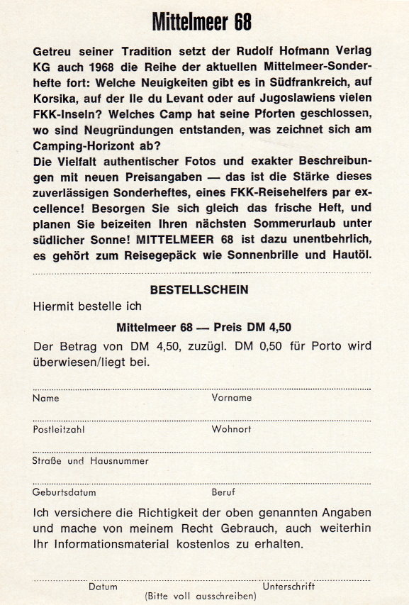 FKK-Prospekte → Beilagen Beilage... für dsa Sonderheft „Mittelmeer 68”. Diese kleinen »Prospekte« waren lose den Heften beigefügt.