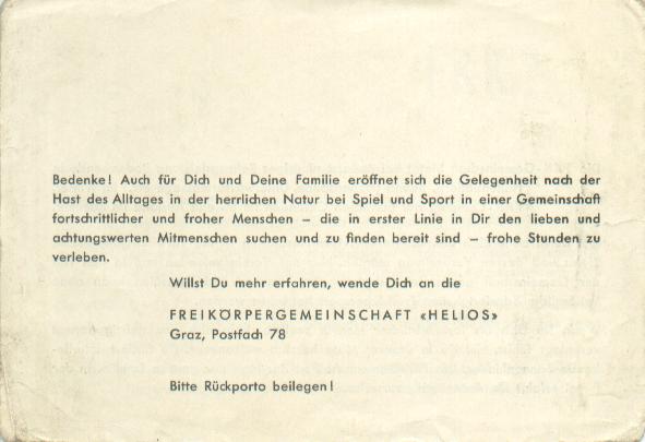 FKK-Prospekte Kleiner Prospekt, der für die Freikörperkultur und den Verein » HELIOS « in Österreich wirbt.