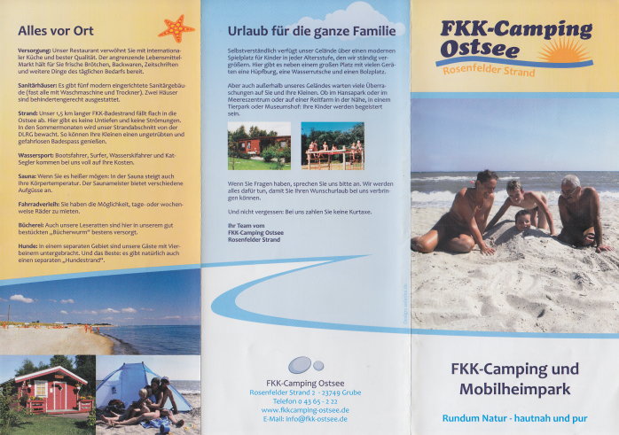 Prospekte für FKK-Camping an der Ostsee, dem Rosenfelder Strand. Mit Informationen und Bildern zu den Stellplätzen und den Aktivitäten.
