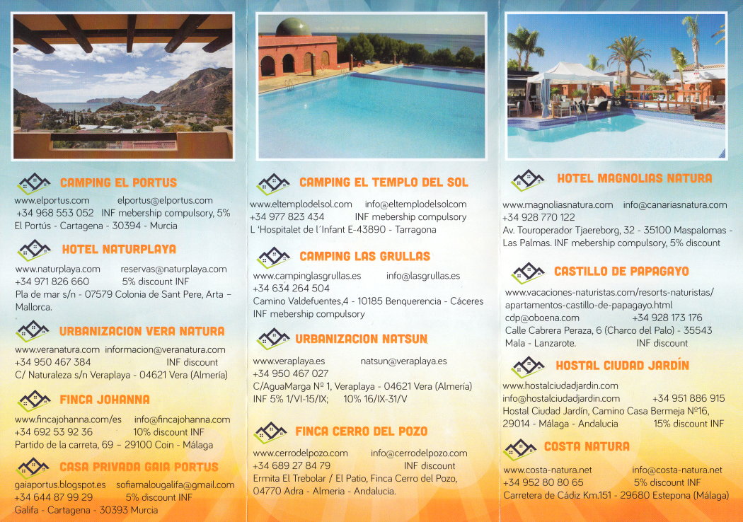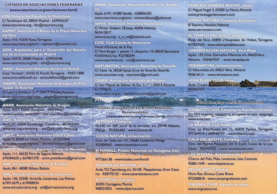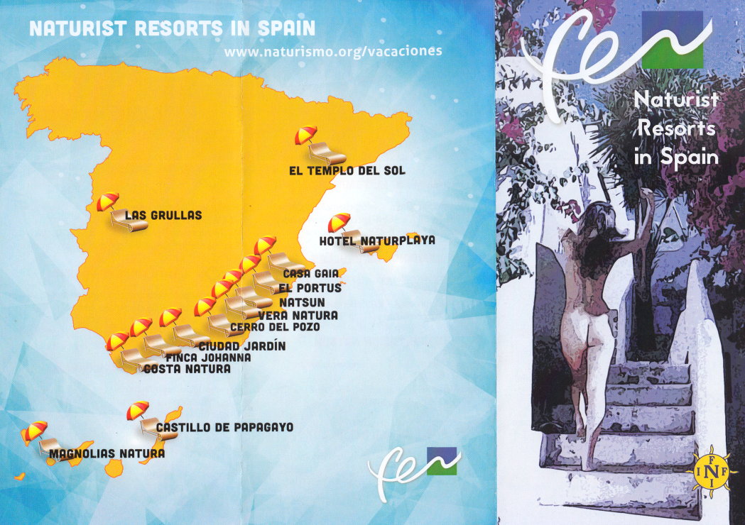 Faltblatt der Federacion Española de Naturismo (FEN), der Naturisten-Föderation aus Spanien. Dieses Flatblatt enthält eine Landkarte von Spanien und den zu Spanien gehörenden Inseln mit den FKK-Stränden (Vereine und Adressen).