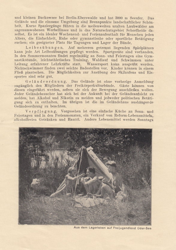 Vierseitiger Prospekt (gefaltet im Format DIN A5) aus den 30er Jahren. Vorgestellt wird das FKK- und Jugendgelände „Freijugendland Üdersee”, welches sich am Üder- und dem kleinen Buckowsee bei Berlin-Eberswalde befindet. Verwaltet wird die Anlage vom „Bund für freie Körperschulung e.V.” (angeschlossen im RFK).