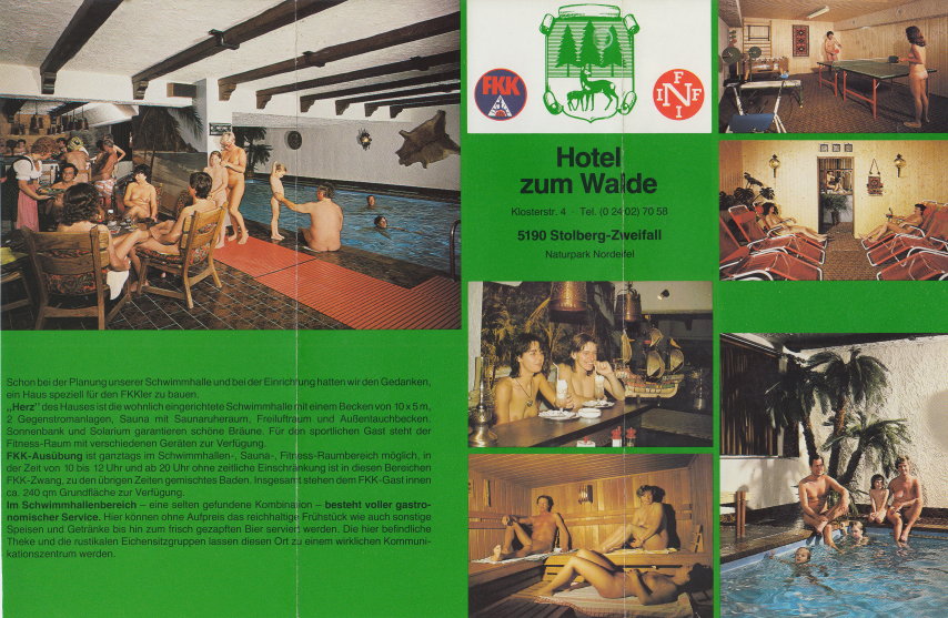 Das Hotel im Naturpark Nordeifel gelegen, gilt als die erste Adresse als „Schlechtwetter-Hotel” für Naturisten. Im Schwimmbad und der Sauna ist Nacktheit den ganzen Tag möglich, wobei zu einigen Zeiten auch »bekleidete« Badegäste Zutritt haben. In diesem, etwas älteren Prospekt, werden die FKK-Bereiche vorgestellt.