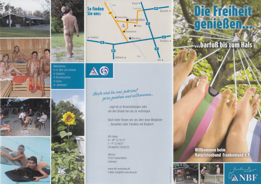 Die Freiheit genießen ...... barfuß bis zum HalsWerbeprospekt vom Naturistenbund Frankenland e.V. (NBF) in Gütersleben. Mit Anfahrtskizze, Informationen und Bildern zu den Aktivitäten des Vereines. Weitere Information unter: www.nbf-wuerzburg.de