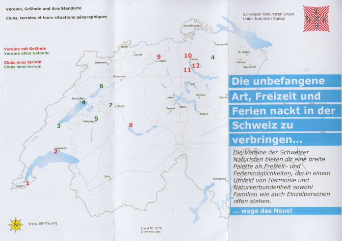 Prospekt der Schweizer Naturisten Union (SNU) mit einer Übersicht der Vereine mit ohne eigenem Gelände.