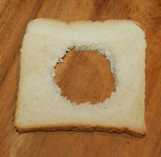 Zuerst wird in das Toastbrot ein Loch von ca. 4 bis 5 cm geschnitten und dieses dann ganz kurz von beiden Seiten in einer leicht gefetteten Pfanne angebraten. Dann ein rohes Ei aufschlagen und in das Loch der Toastscheibe geben. Durch Wenden beidseitig festbraten, etwas salzen - fertig !