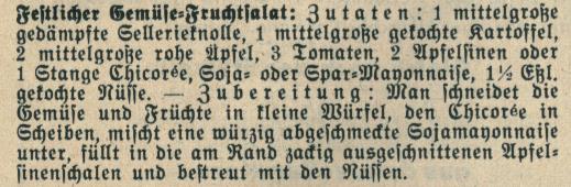 Man schneidet das Gemüse und die Früchte in kleine Würfel, den Chicorée in Scheiben, mischt eine würzig abgeschmeckte Soja- mayonnaise unter, füllt alles in die am Rand zackig ausgeschnit- tenen Apfelsinenschalen und bestreut es mit den Nüssen. |