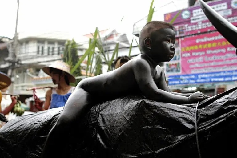 Vor dem Rennen erfolgt noch eine kleine Parade, bei der nackte Jungen, die komplett in Schwarz oder in Silber bemalt sind, auf den Büffeln zum Startplatz geführt werden. Die kleineren Jungen sitzen dabei (zur Sicherheit) auf einer Büffel-Attrappe.