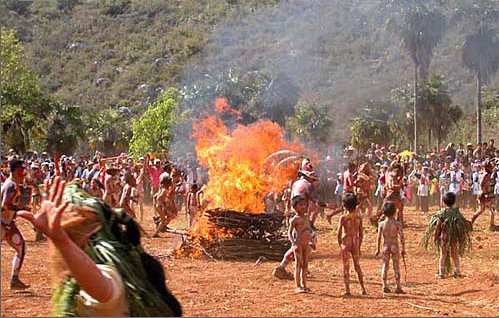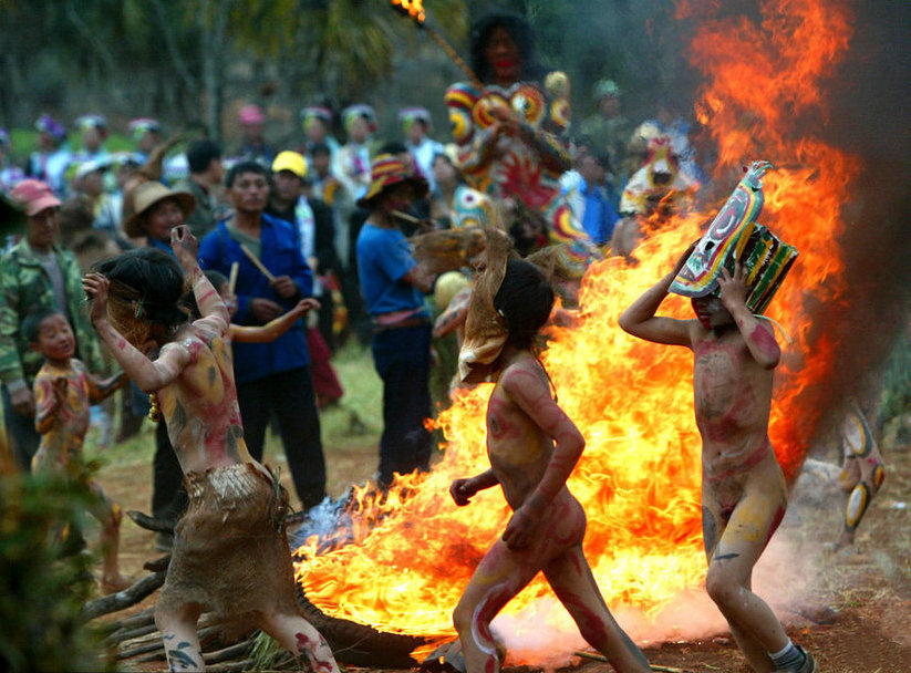 Zum Feuer-Festival werden traditionell in den Häusern alle „alten” Feuer gelöscht und die Feuerstellen gereinigt. Eine Aufgabe, die den Frauen und Mädchen zukommt. Unterdessen entfachen die Männer und die Jungen nach alten Methoden „neue” Feuer. Nebenbei gibt es noch eine große Feuerstelle, Mittelpunkt des Festes. Hier wird dann nicht nur gesungen und getanzt, sondern auch kleine Wettbewerbe veranstaltet. Alle männlichen Teilnehmer sind dabei mit großen Kreisen und Punkten bemalt - Muster als Verehrung der Natur. Die erwachsenen Männer tragen dabei einen kleinen Lendenschurz, die Jungen sind komplett nackt. Je nach Region werden Hüte oder Masken getragen.