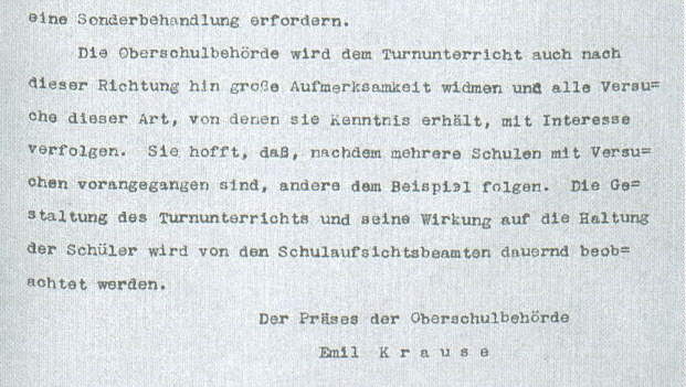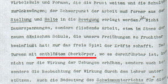Wie die Oberschulbehörde weiter empfiehlt, sollte das Turnen dann auch mit entblößtem Oberkörper stattfinden. Auf diese Art und Weise konnte das Lehrpersonal besser die Übungen kontrollieren und ggf. sofort korrigieren.