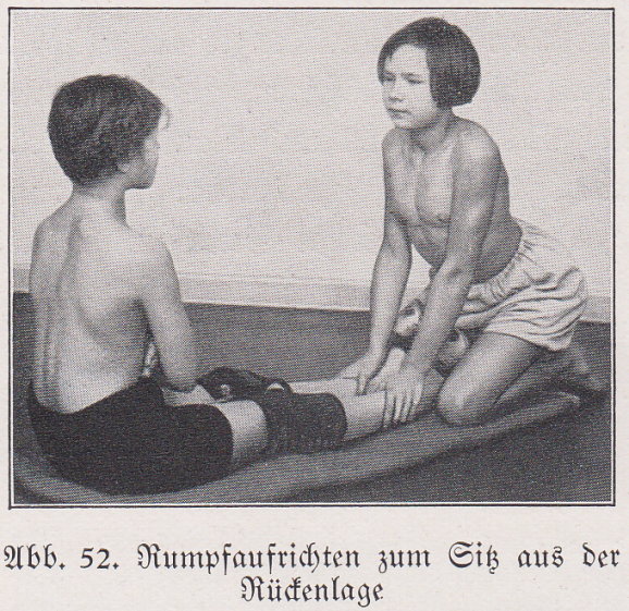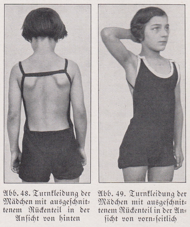 Zitat „Unsere Turnhosen sind so geschnitten, dass sie nur hinten von einem kleineren Gummizug gehalten werden, vorn aber glatt ansitzen. Auch Mädel sollen ... im Sommer mit nackten Oberkörper turnen, der Rumpf entwickelt sich besser; die Haut, die Sonne und Luft atmet, bleibt geschmeidig...” (2)