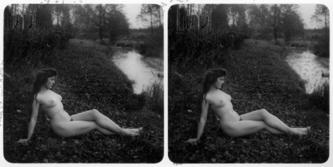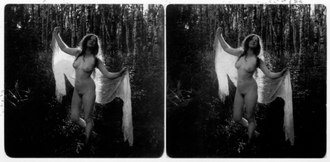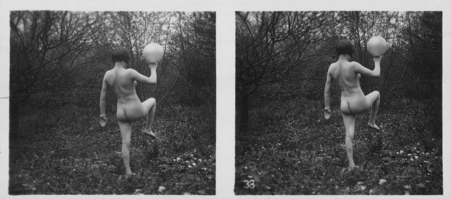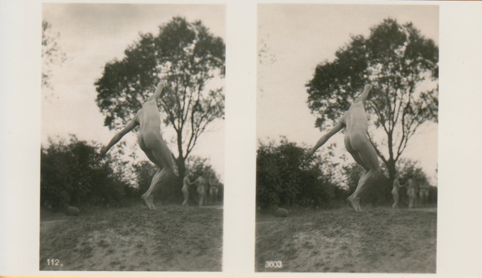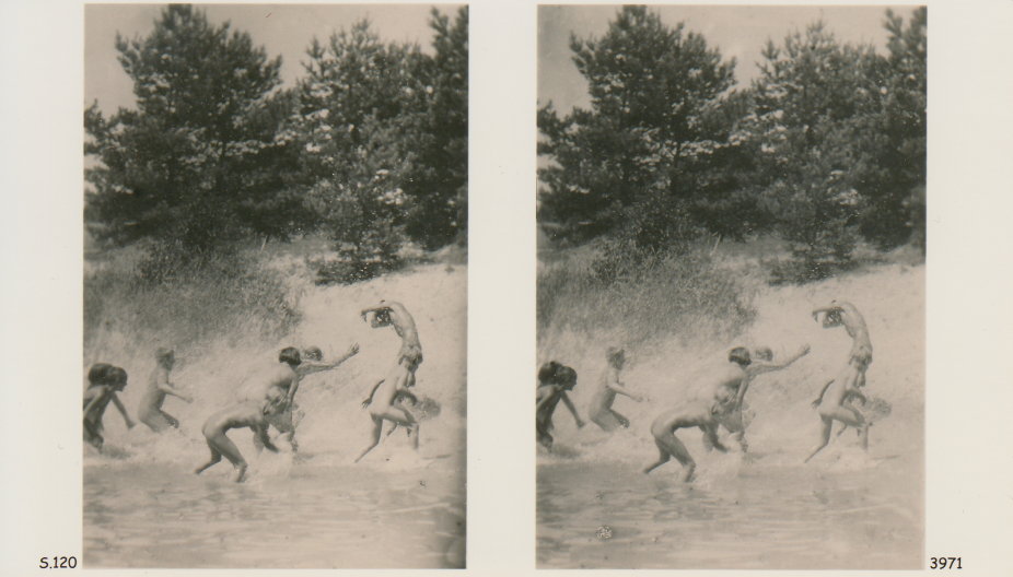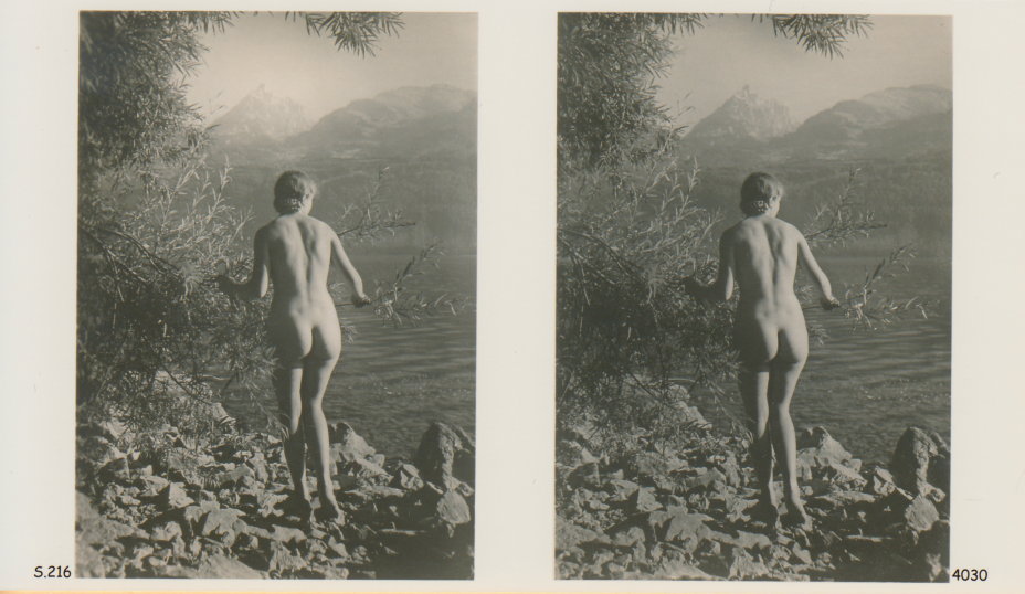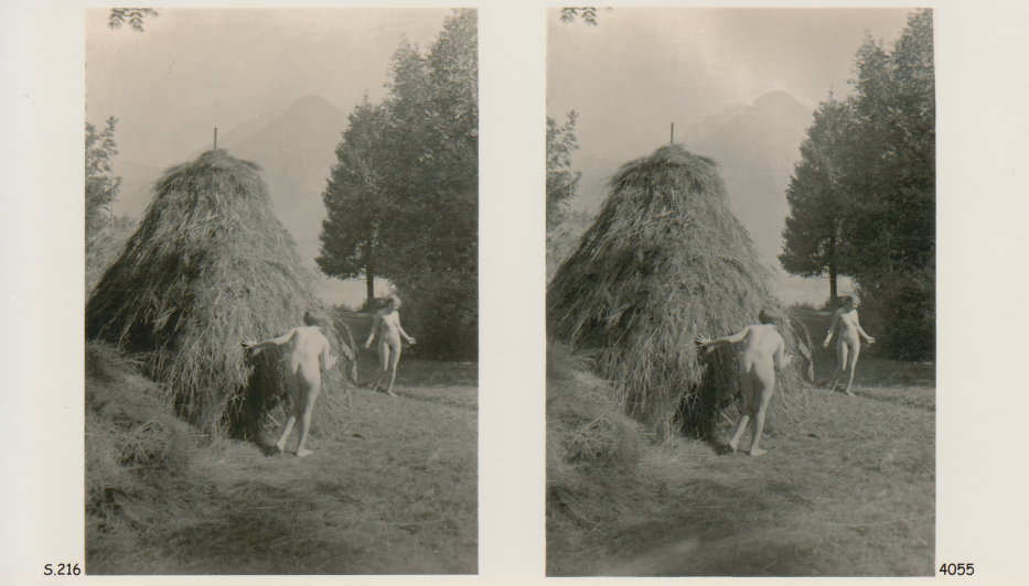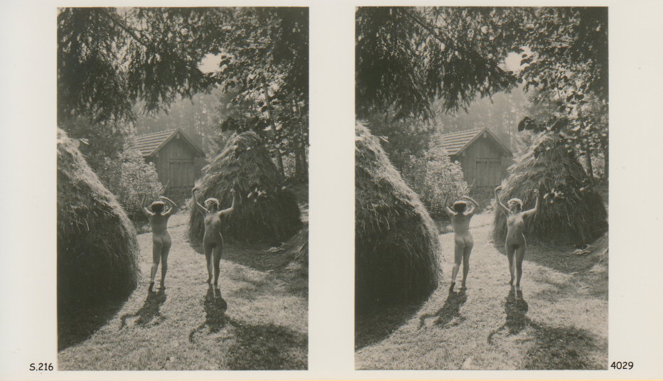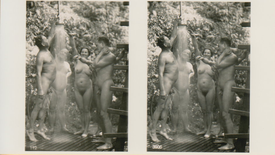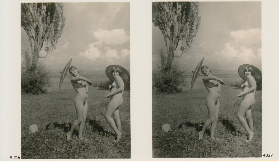 | Mittels zweier, fast identischer Bilder, lässt sich ein Motiv mit einem Stereoskop so wiedergeben, dass ein räumlicher Eindruck von Tiefe entsteht (siehe auch: Wikipedia → Stereoskopie). Eine fotografische Technik, welche auch schnell Einzug in die Fotografie der damaligen Nacktkultur fand. |