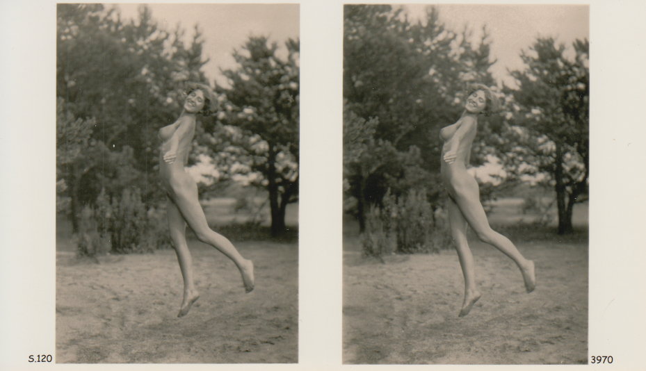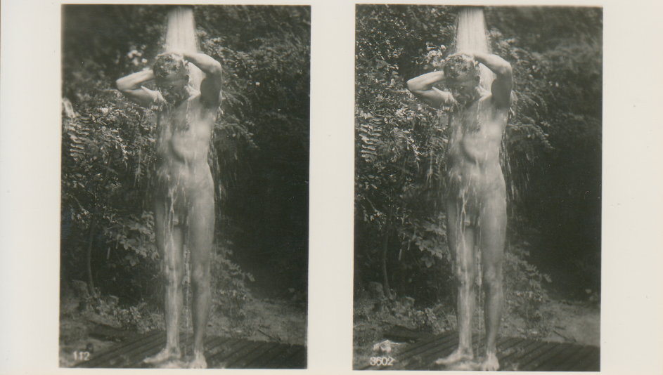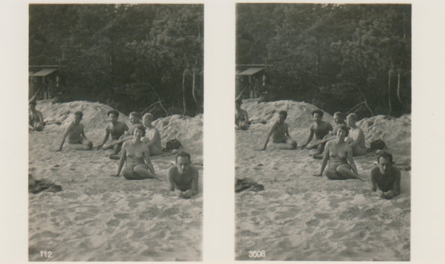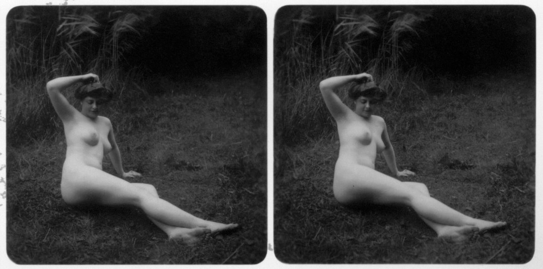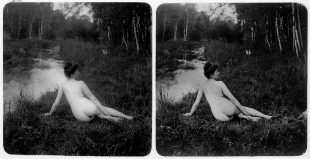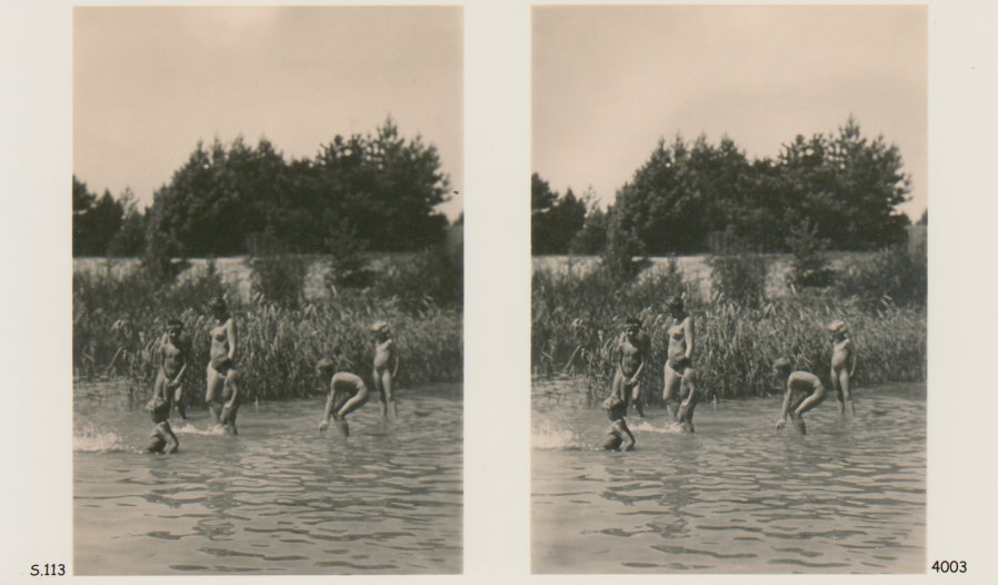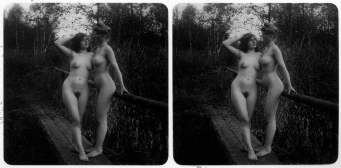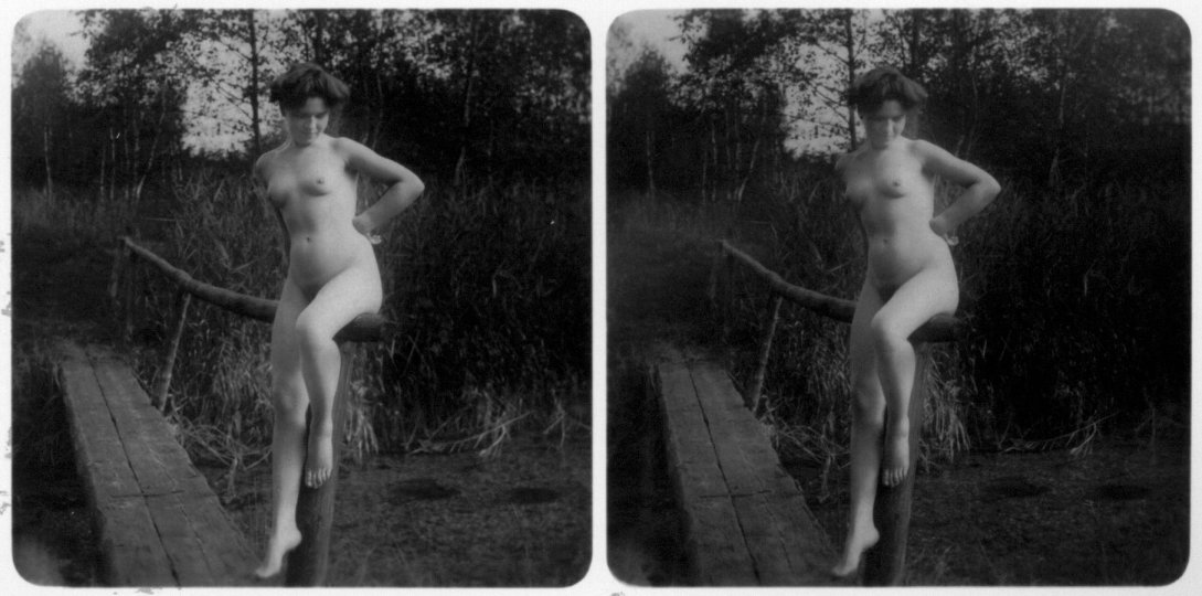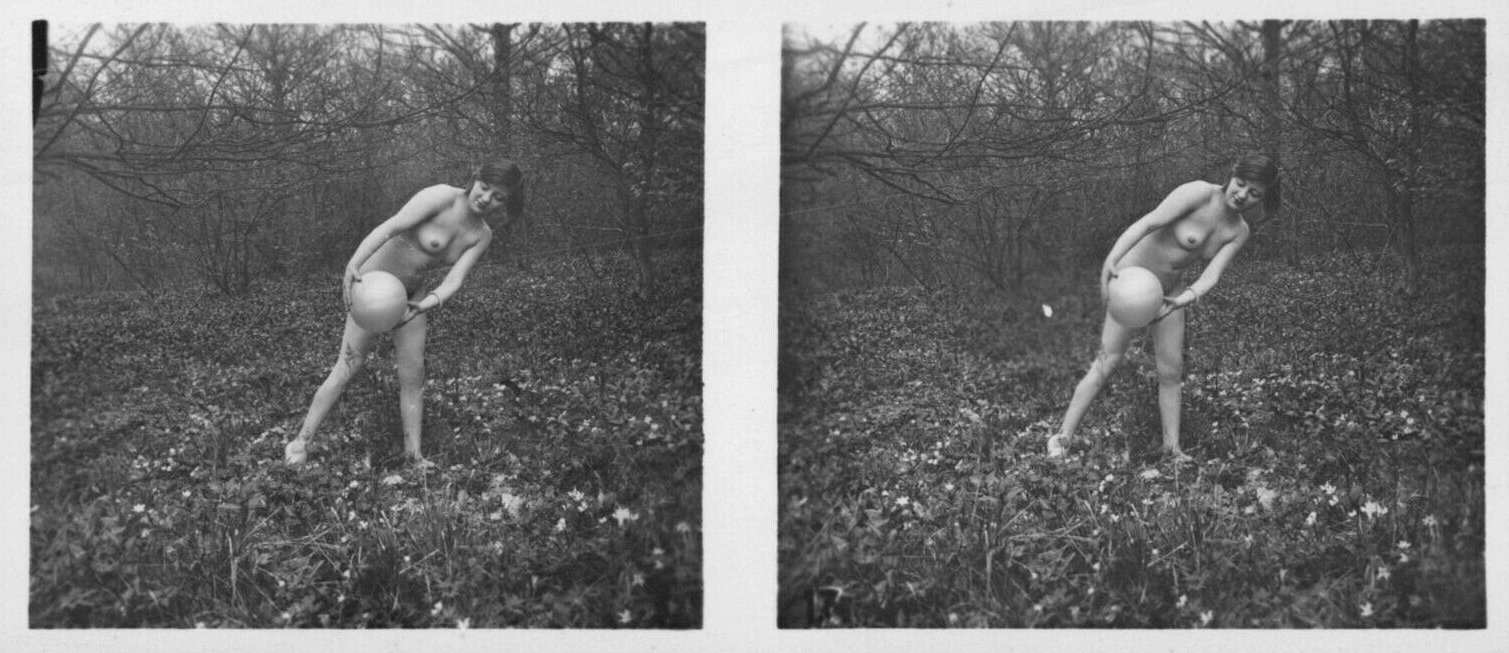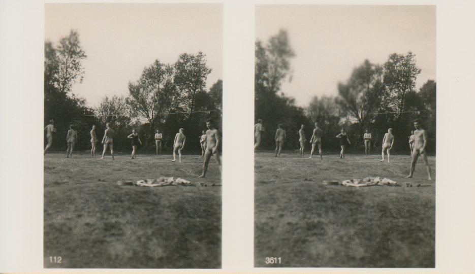 | Mittels zweier, fast identischer Bilder, lässt sich ein Motiv mit einem Stereoskop so wiedergeben, dass ein räumlicher Eindruck von Tiefe entsteht (siehe auch: Wikipedia → Stereoskopie). Eine fotografische Technik, welche auch schnell Einzug in die Fotografie der damaligen Nacktkultur fand. |