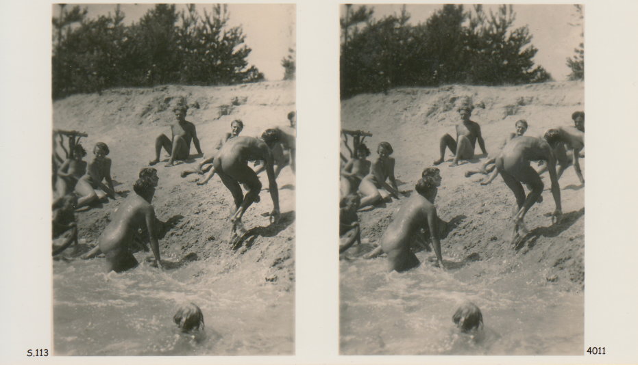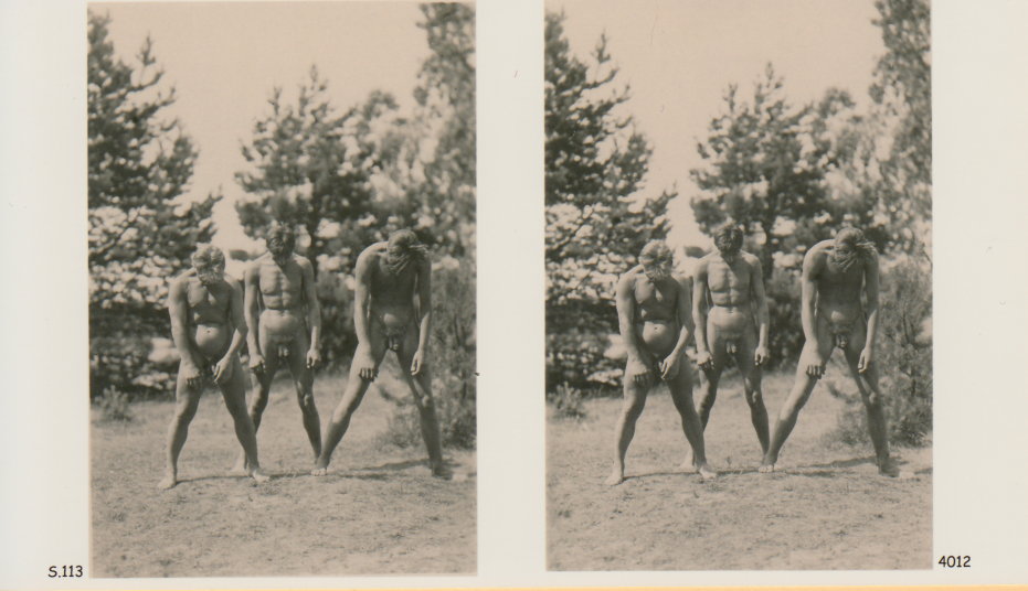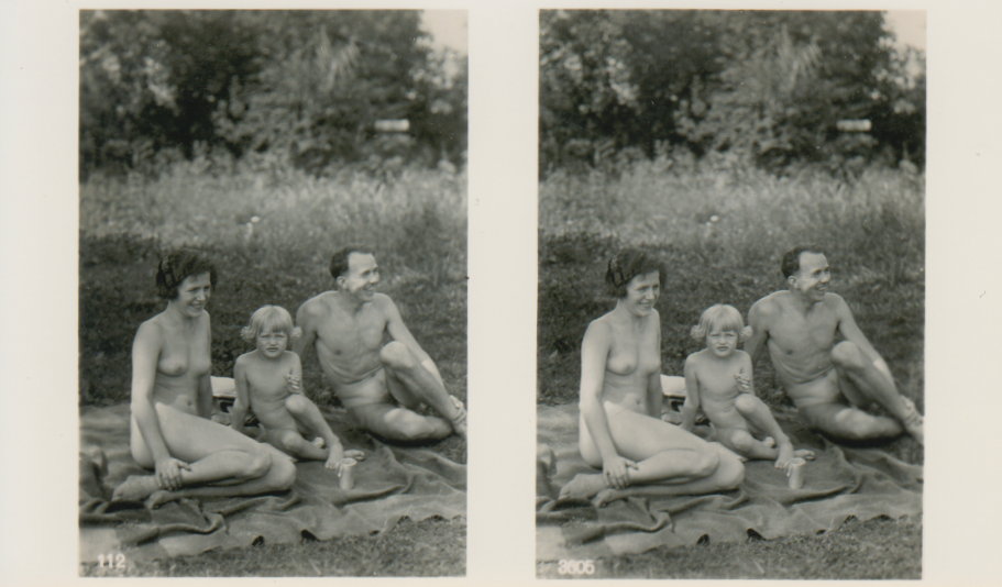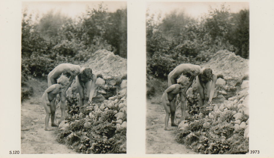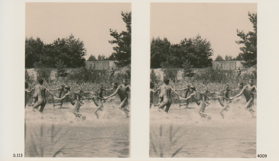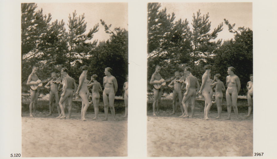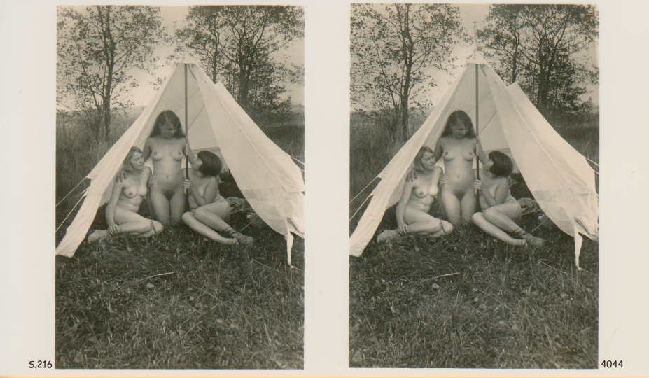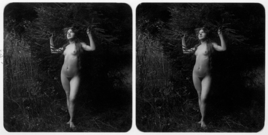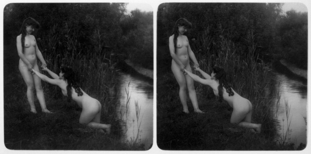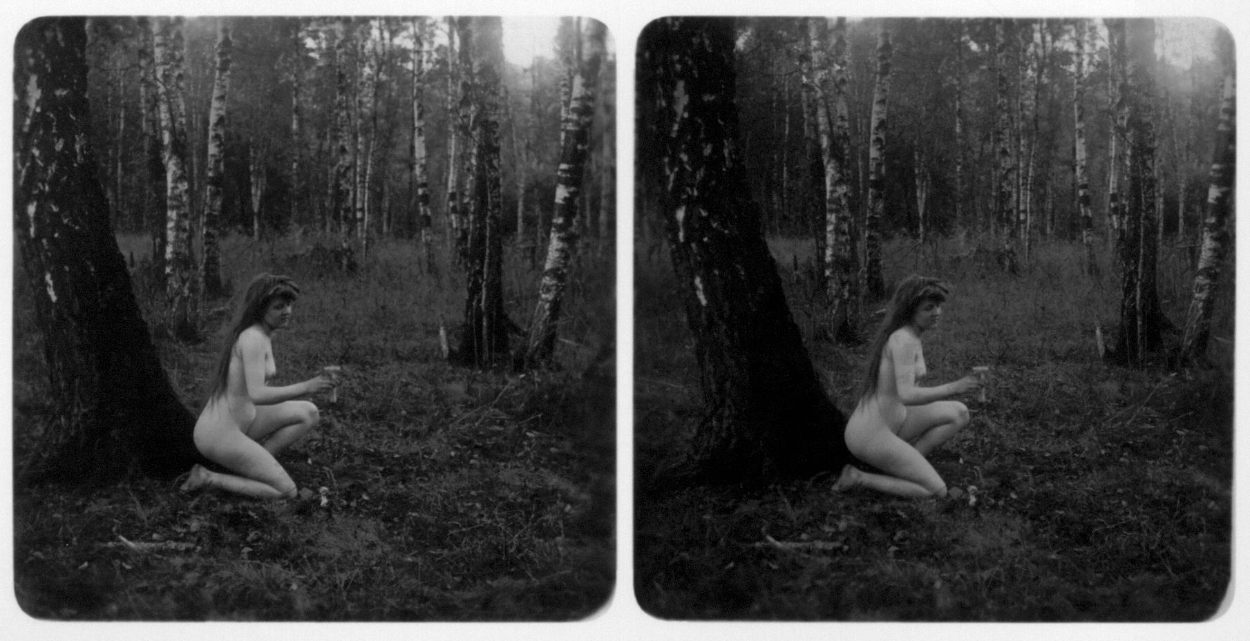 | Mittels zweier, fast identischer Bilder, lässt sich ein Motiv mit einem Stereoskop so wiedergeben, dass ein räumlicher Eindruck von Tiefe entsteht (siehe auch: Wikipedia → Stereoskopie). Eine fotografische Technik, welche auch schnell Einzug in die Fotografie der damaligen Nacktkultur fand. |