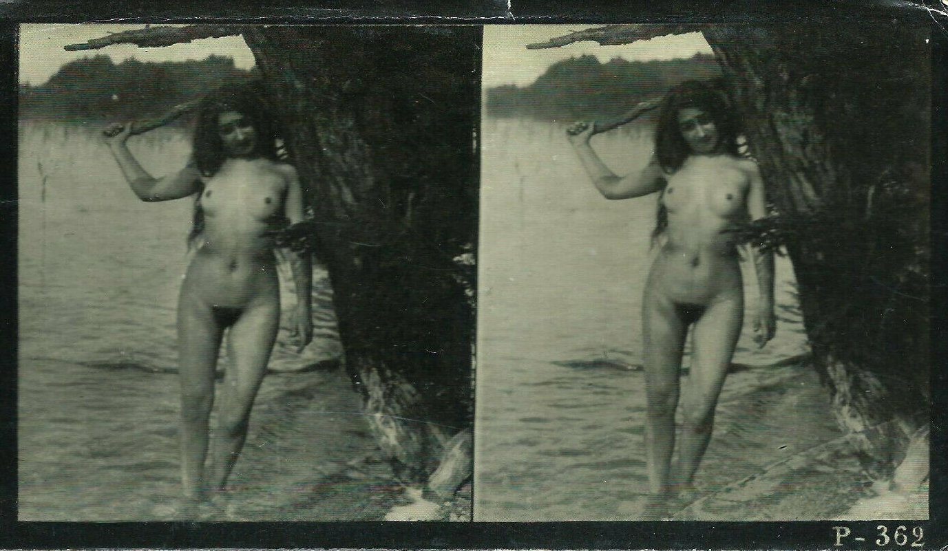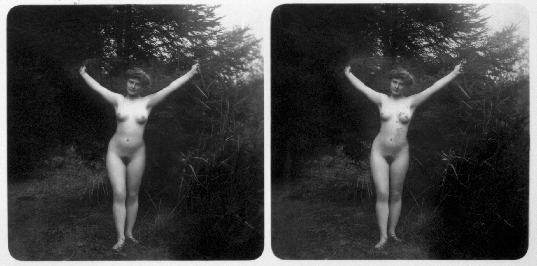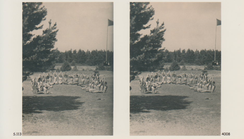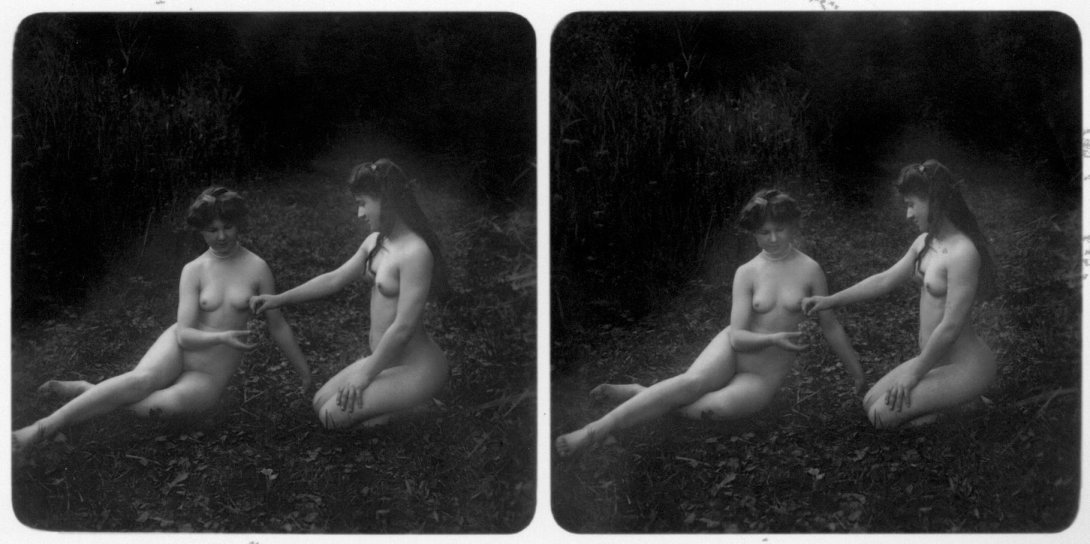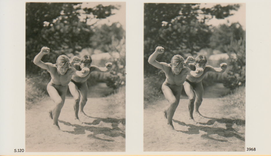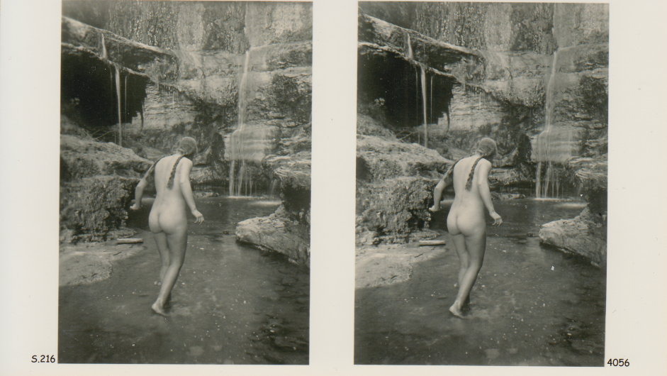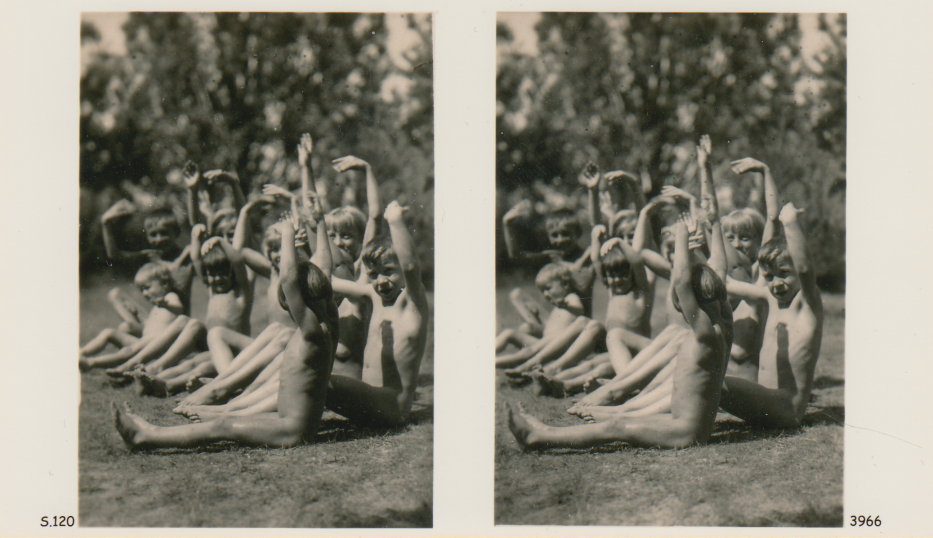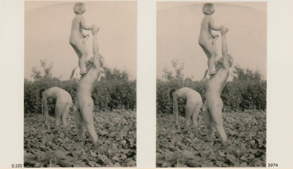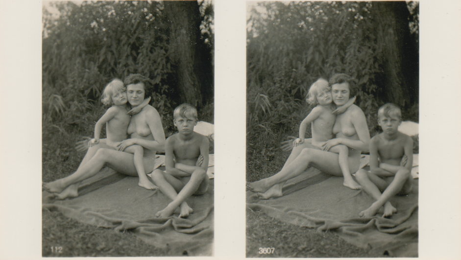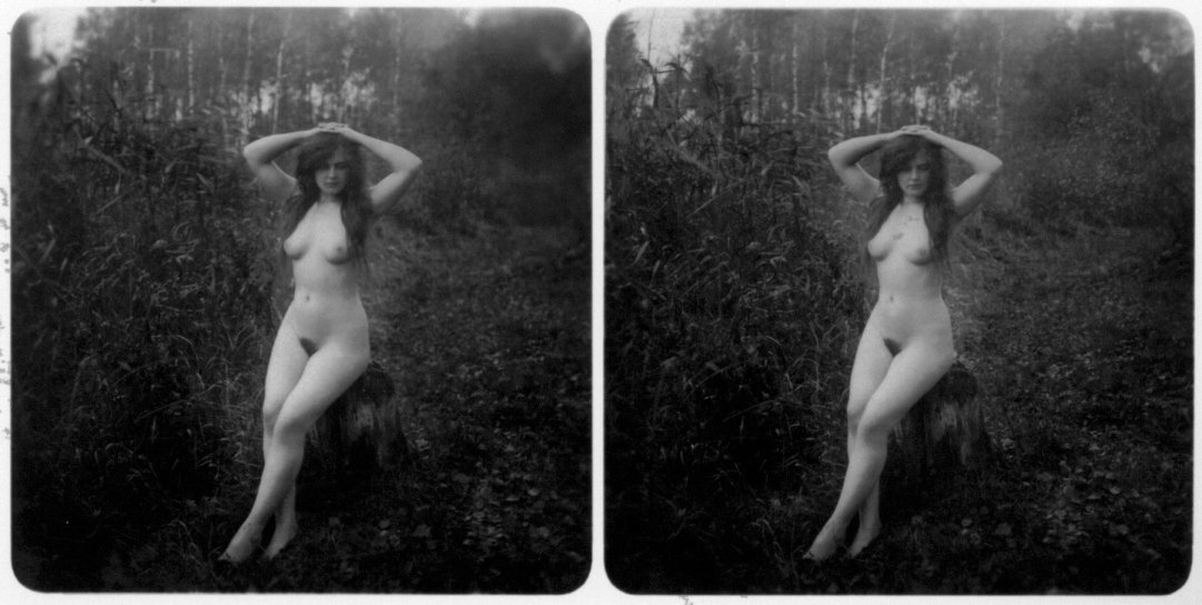 | Mittels zweier, fast identischer Bilder, lässt sich ein Motiv mit einem Stereoskop so wiedergeben, dass ein räumlicher Eindruck von Tiefe entsteht (siehe auch: Wikipedia → Stereoskopie). Eine fotografische Technik, welche auch schnell Einzug in die Fotografie der damaligen Nacktkultur fand. |