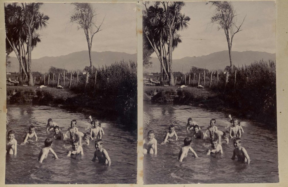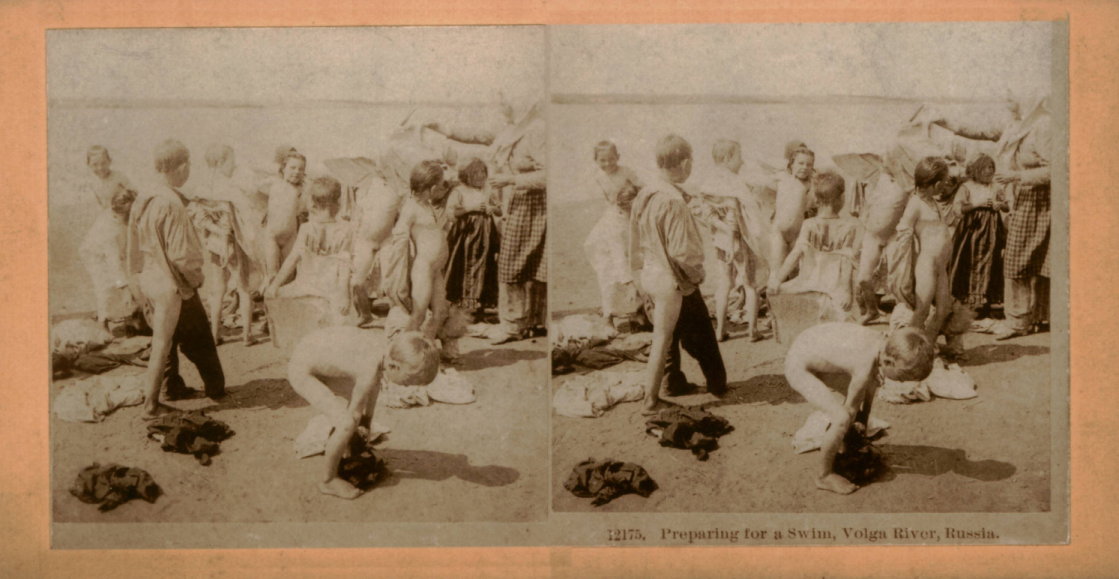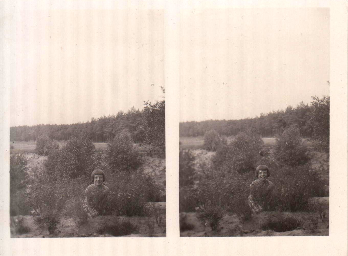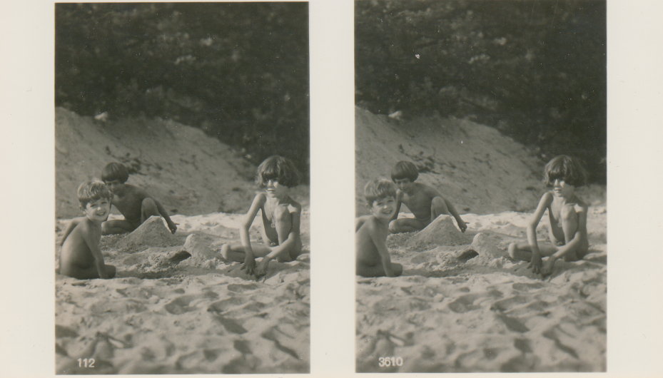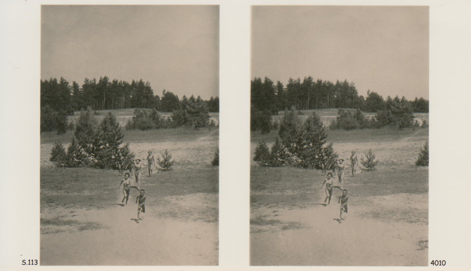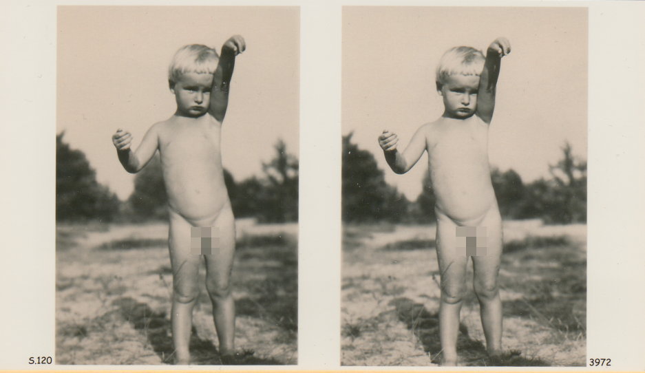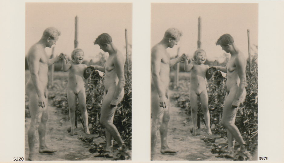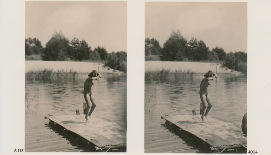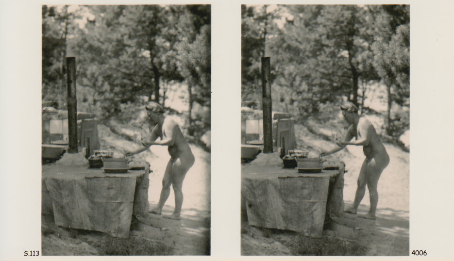 | Mittels zweier, fast identischer Bilder, lässt sich ein Motiv mit einem Stereoskop so wiedergeben, dass ein räumlicher Eindruck von Tiefe entsteht (siehe auch: Wikipedia → Stereoskopie). Eine fotografische Technik, welche auch schnell Einzug in die Fotografie der damaligen Nacktkultur fand. |