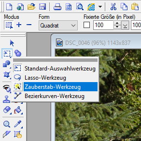 Bei den Auswahlwerkzeugen zum Ausschneiden wählt Ihr dann den „Zauberstab”, der alle gleichen Fabrteile eines Bildes „ausschneidet” |