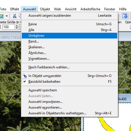 Bei dem Reiter „Auswahl” klickt Ihr nun auf „Umkehren” ... wir möchten ja schließlich nicht die weiße Fläche in unser Foto kopieren. |