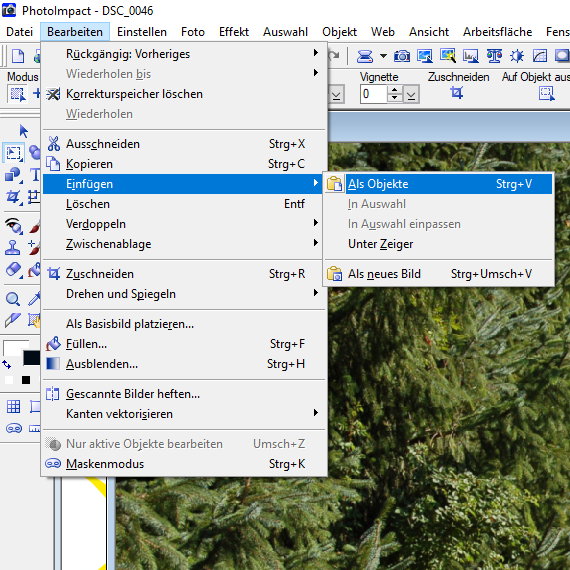 Wieder nehmt Ihr den Reiter „Bearbeiten” und klickt nun „Einfügen” und wählt dann „Als Objekte”. |