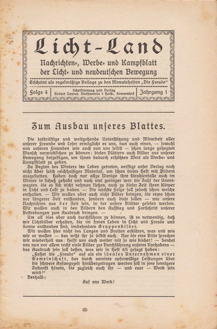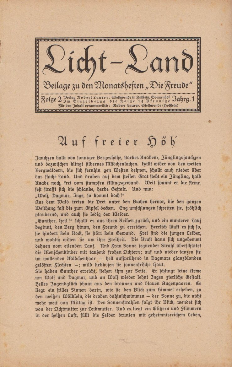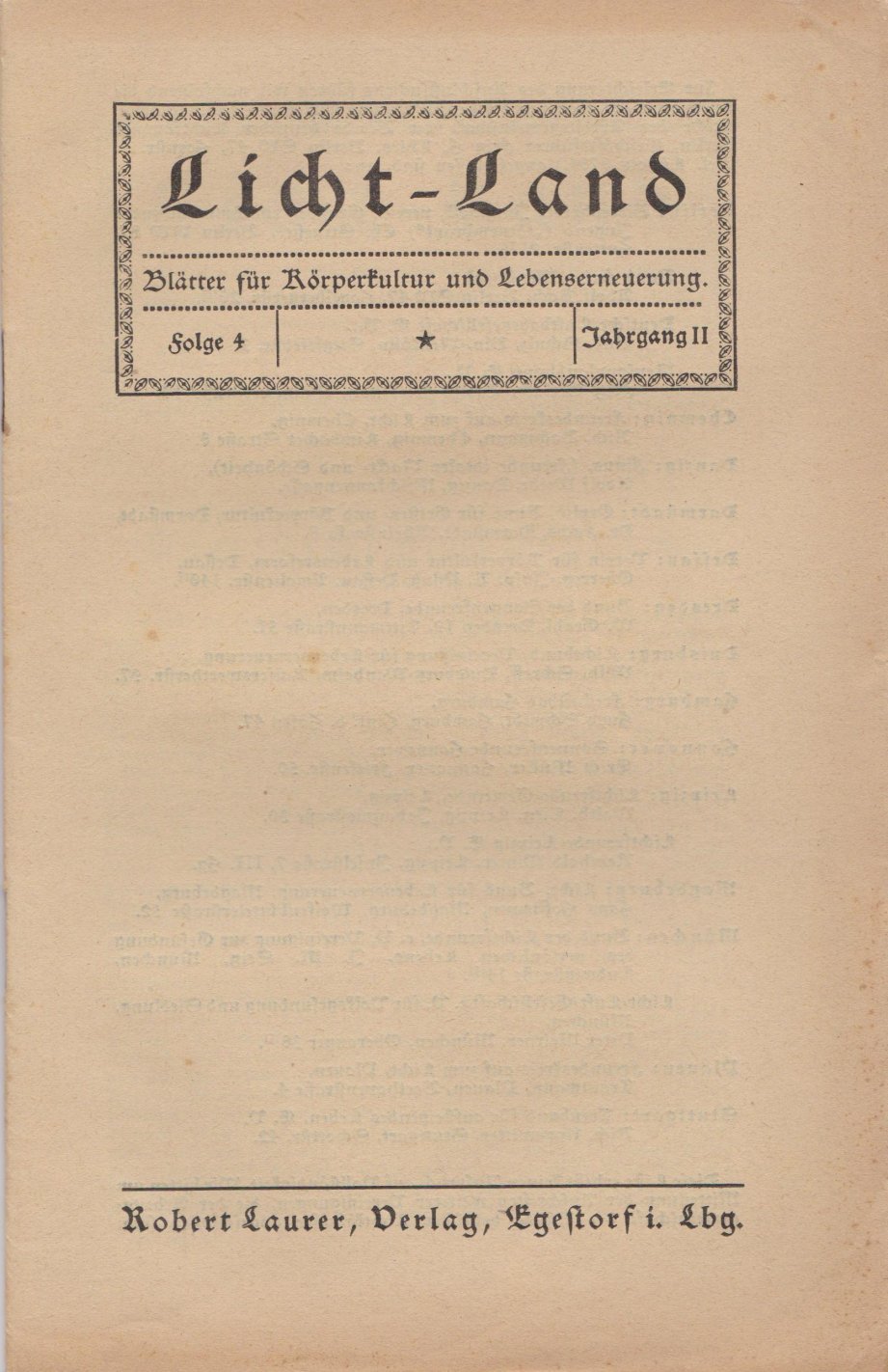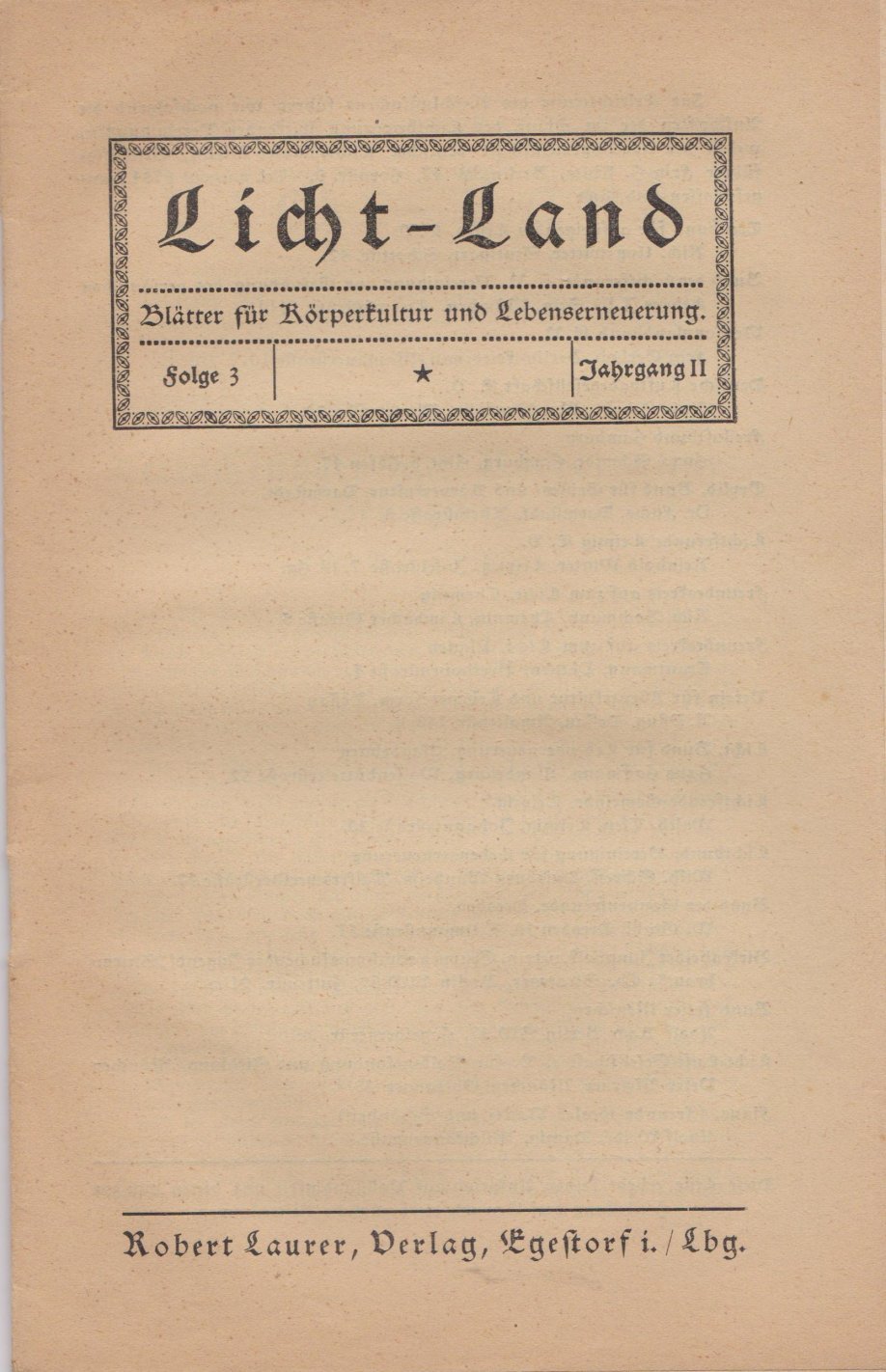 Die Zeitschrift „Licht-Land” erschien 10 Jahre lang, von 1924 bis 1933 und hatte ab den späten 1920er Jahren einen Umfang von 10 bis 16 Seiten, wobei es zunächst nur drei weitere Bildseiten, neben dem Titelbild, pro Ausgabe gab.