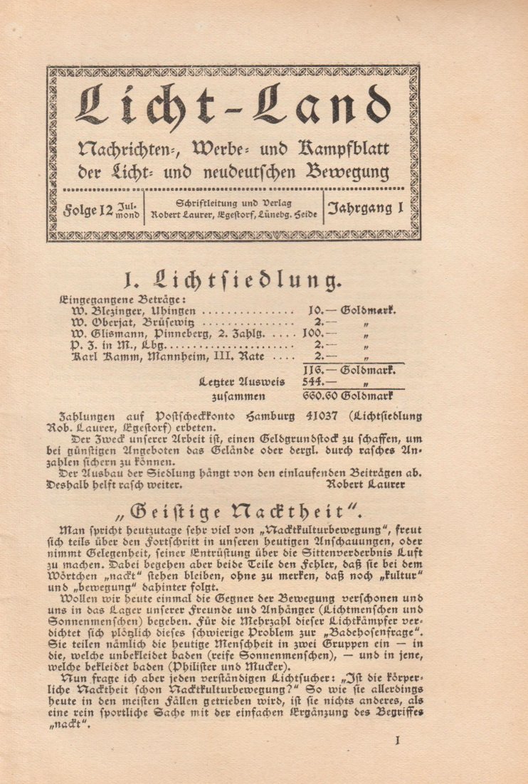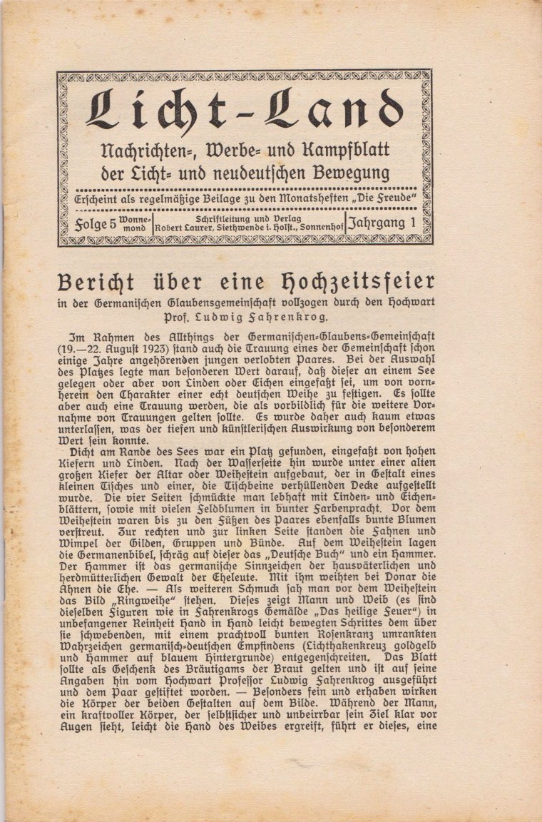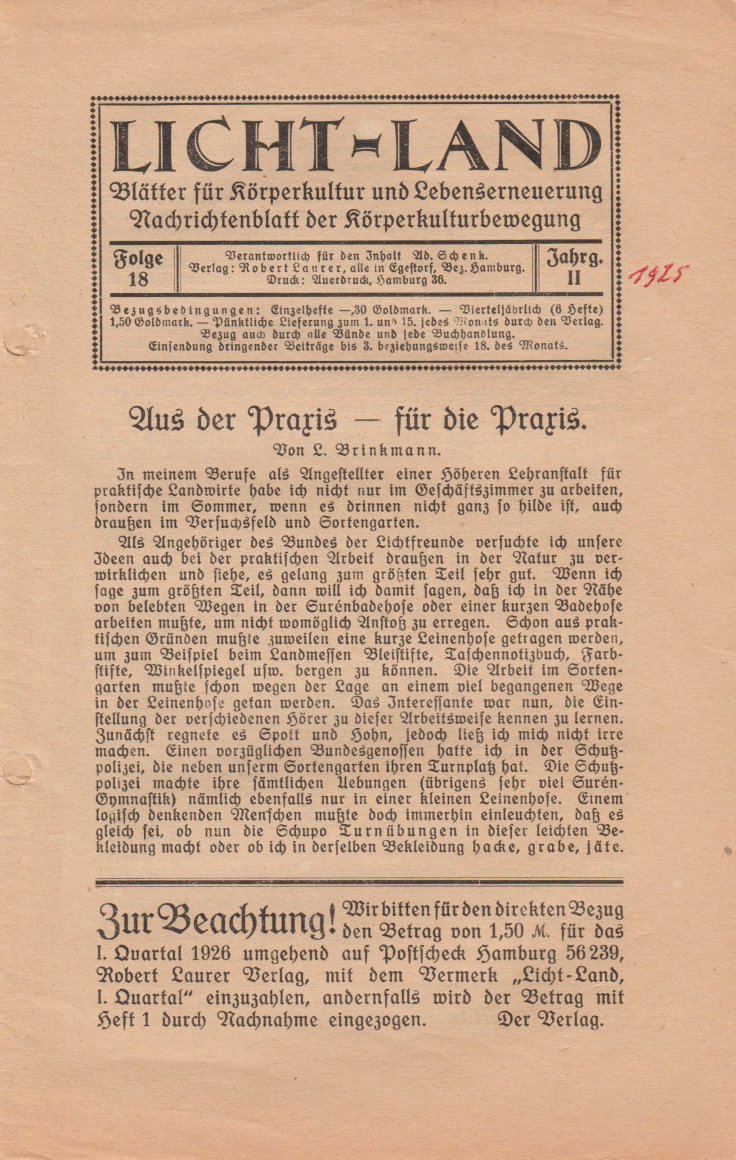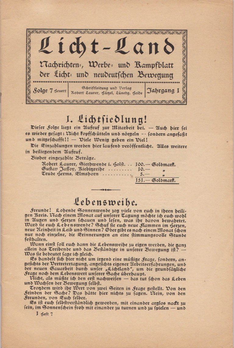 Die Zeitschrift „Licht-Land” erschien 10 Jahre lang, von 1924 bis 1933 und hatte ab den späten 1920er Jahren einen Umfang von 10 bis 16 Seiten, wobei es zunächst nur drei weitere Bildseiten, neben dem Titelbild, pro Ausgabe gab.