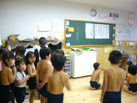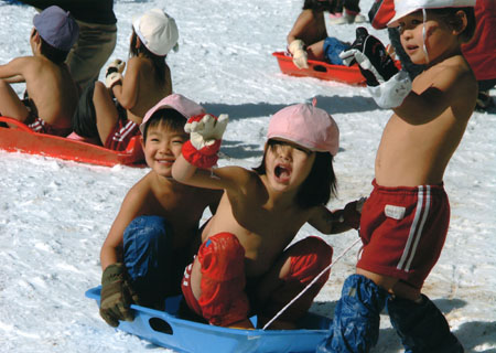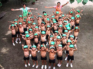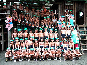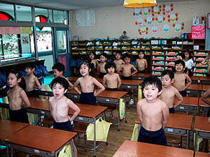 Als Beispiel dient der »Hikari«-Kindergarten in Kawasaki (Kanagawa, Japan), wo es gleich mehrere Einrichtungen dieser Art gibt. Dieser Kindergarten (mit Vorschul-Erziehung) besteht seit 1953. Anfänglich waren die Kinder dabei ganz nackt, inzwischen (nur) noch »oben-ohne« - Jungen, wie auch Mädchen.