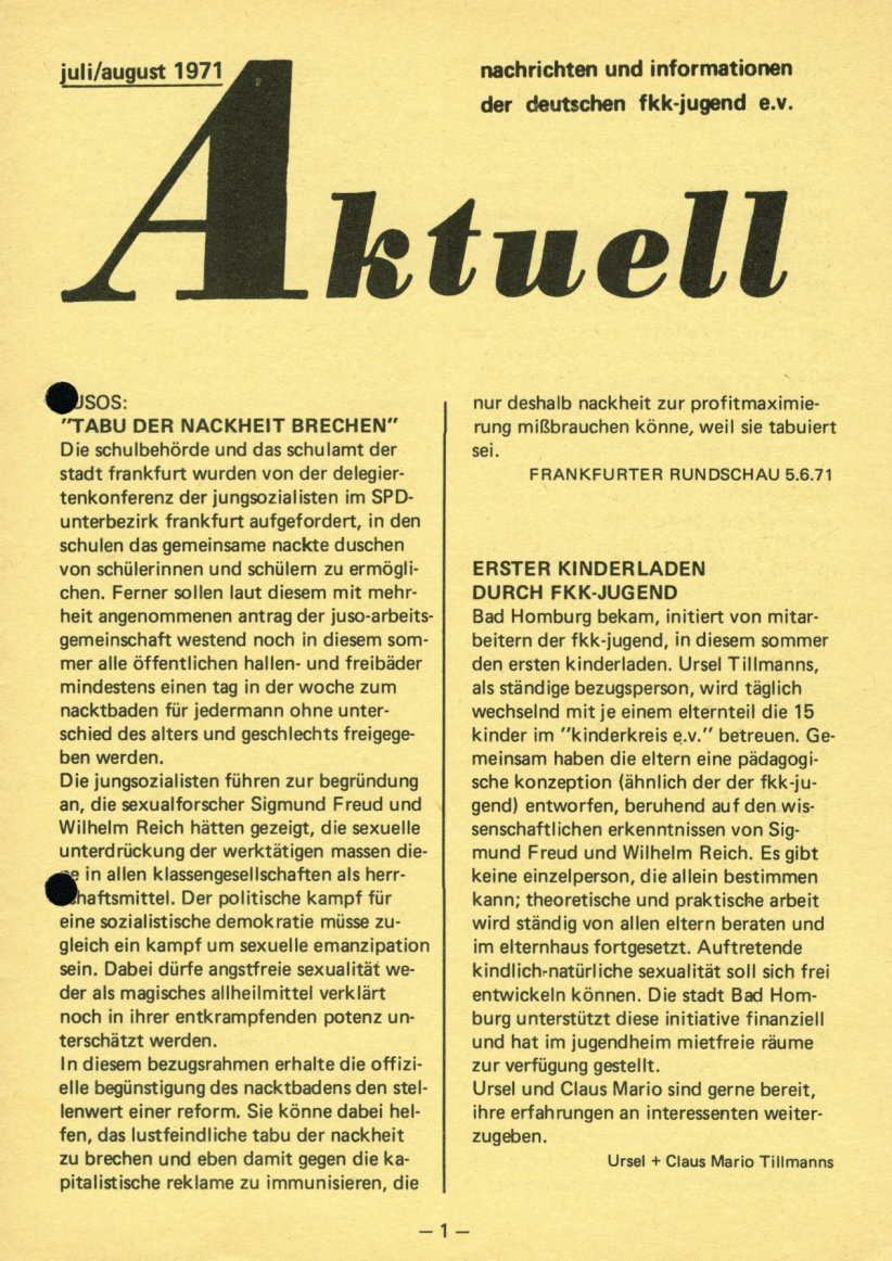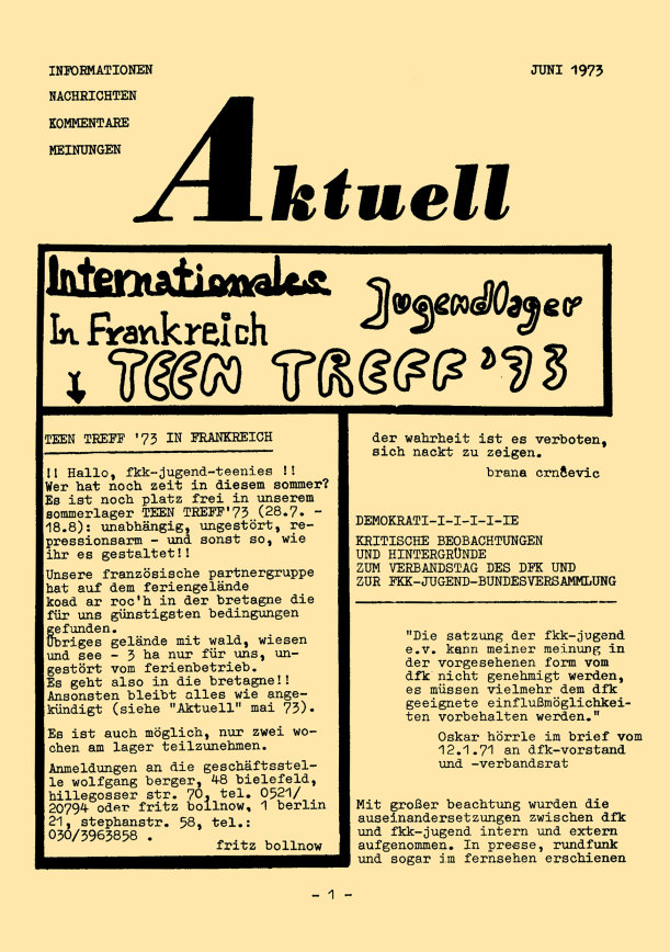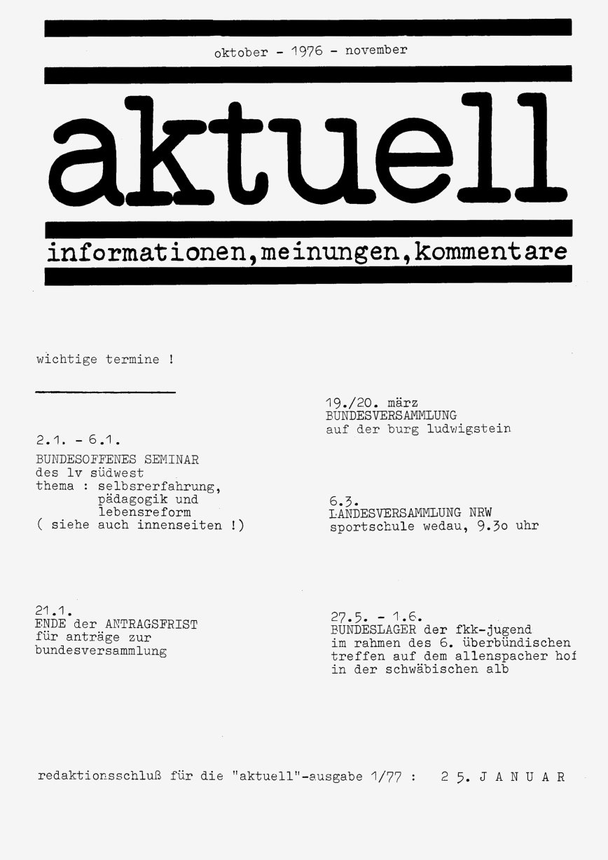 Mein besonderer Dank bei der Unterstützung und Hilfe zu den Informationen zur fkk-jugend und ihrer Publikationen gehen an Erhard Hagebeuker und Andreas Fischer.