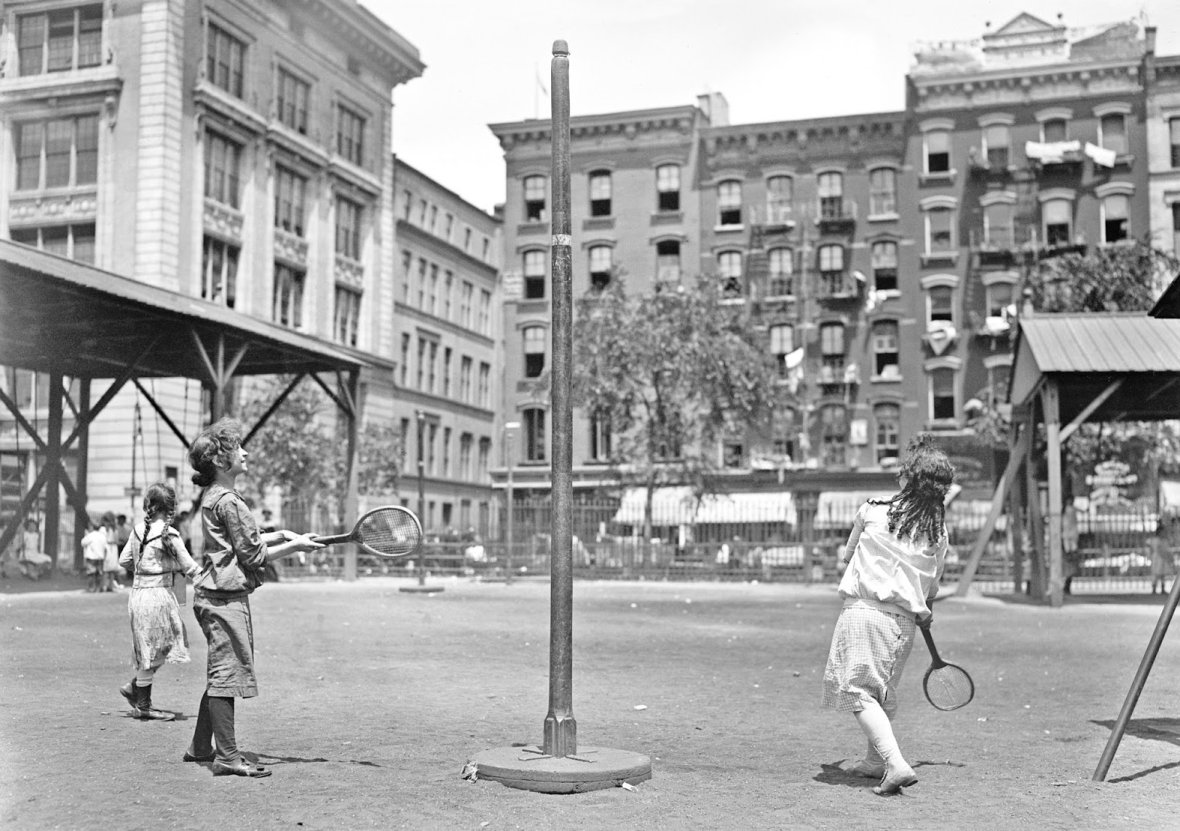 Historisches Bild zweier Mädchen, wie sie „Twistball” spielen (New York um 1910).