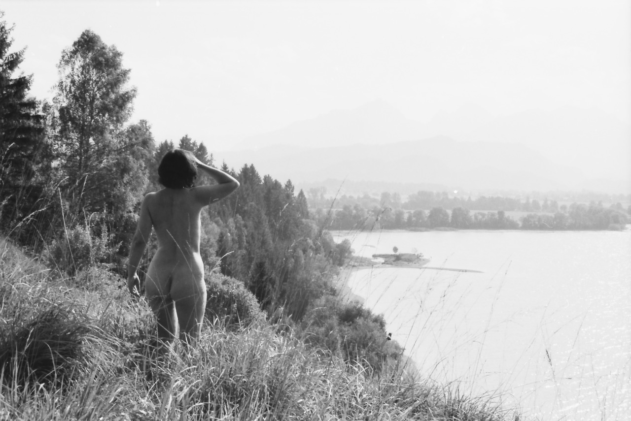 Hinter uns steigt das grasbewachsene Ufer steil an. Kathy deutet auf eine kleine Baumgruppe den Hang hinauf. Von dort oben müßten wir einen wunderbaren Ausblick haben. Bauchhohes Büffelgras, jetzt im Spätsommer fest und gelb wie Stroh, drängt sich an unsere Körper. Vorsichtig steigen wir aufwärts. Unsere nackten, empfindlichen Füße sind kleine, spitze Steine, stachelige Zweige und harten Boden nicht gewöhnt. Hin und wieder stoßen wir auf eine Silberdistel, wunderschön anzusehen aber sehr schmerzhaft, wenn man hineintritt. Bedächtig setzen wir so Schritt vor Schritt, den Kopf gesenkt, mit den Armen den Körper balancierend. Keuchend und schweißnass erreichen wir die Höhe, doch das großartige Panorama entschädigt uns für alle Mühe. Unter uns liegt der hellblaue See in dessen Oberfläche sich der Himmel spiegelt. Am gegenüberliegenden Ufer sehen wir die dichtbefahrene Schnellstraße, doch dringt kein Laut zu uns herüber. In der Ferne, im blaßblauen Dunst erheben sich die Berge. Kathy ist einige Schritte näher an den Rand getreten. Aufrecht steht sie da, den Körper der Sonne zugewendet, den Kopf in den Nacken geworfen, die Augen geschlossen, sie hebt ihre Arme, bereit das wärmende Licht in sich aufzunehmen.