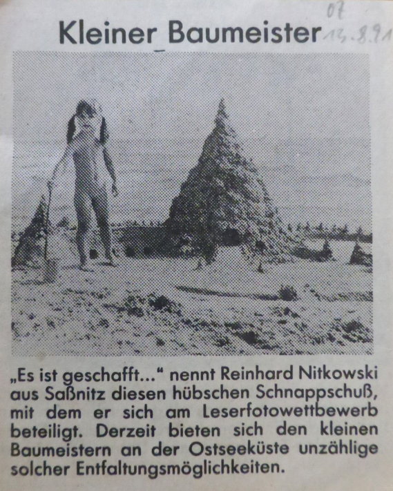 Mit dieser Aufnahme des kleinen Mädchens und der kunstvollen Sandburg nahm er 1980 an einer Kreisfotoschau teil und im August 1991 an einem Leserfotowettbewerb der Ostsee-Zeitung (veröffentlicht am 13.08.1991).