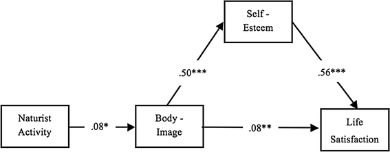 Relationship between naturist activity and life satisfaction, mediated by body-image and self-esteem in Study 1. Note * p <.05; ** < .01; *** < .001