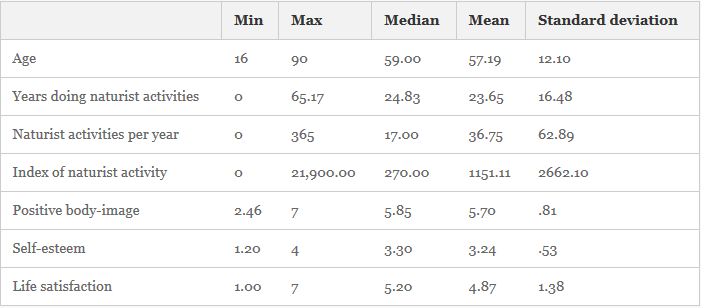 To assess participation naturist activities, participants were asked to indicate (yes vs. no) whether they had ever taken part in “in clothes-free activities (i.e., activities in which you have been fully or partially undressed outdoors and/or in the company of other people (other than your close family or romantic partner).” The language of this question deliberately focused on participants’ behaviour and avoided the labels “nudist” and “naturist”. If a participant responded yes to this initial question, they were asked to indicate (using the year and the month) when they had started participating in these activities and how many of these activities they did in a typical year. Subtracting the date at which the participant started taking part in naturist activities from the date at the end of data collection produced a measure of length of time (in years) doing naturist activities.